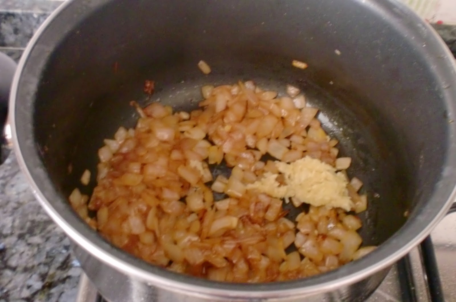 Echamos la cebolla picadita y los ajos y, pochamos vereis que coge color enseguida por el concentrado de gambas.