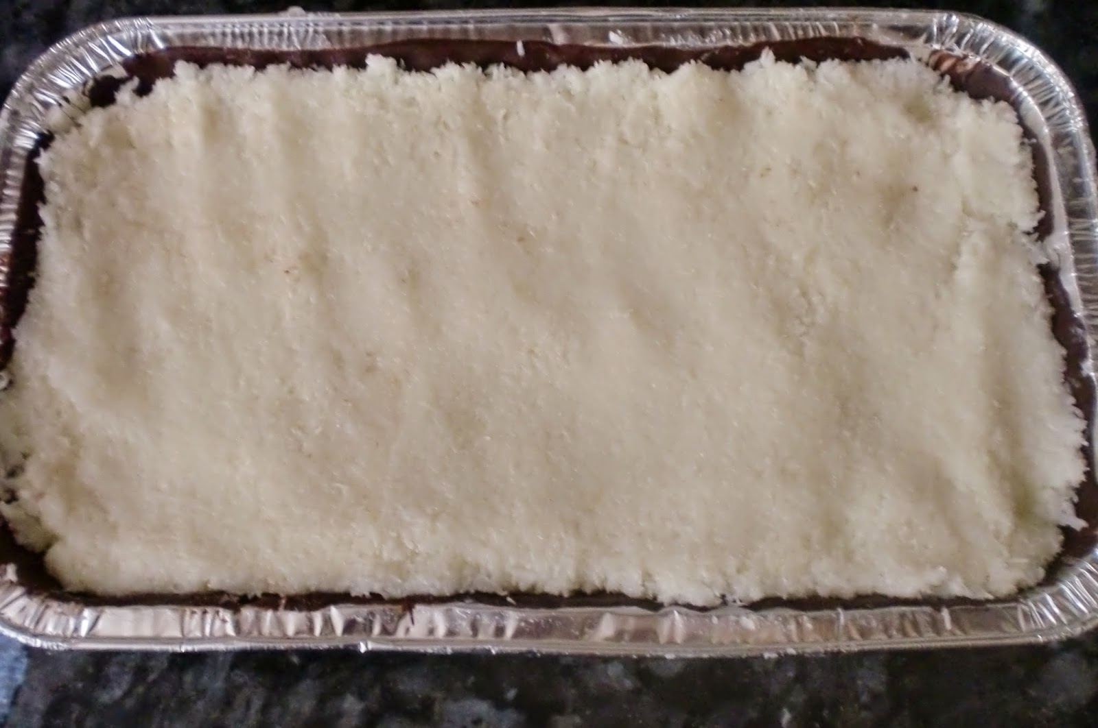 Vertemos la mezcla de coco en el molde, presionando bien para que quede compacto.