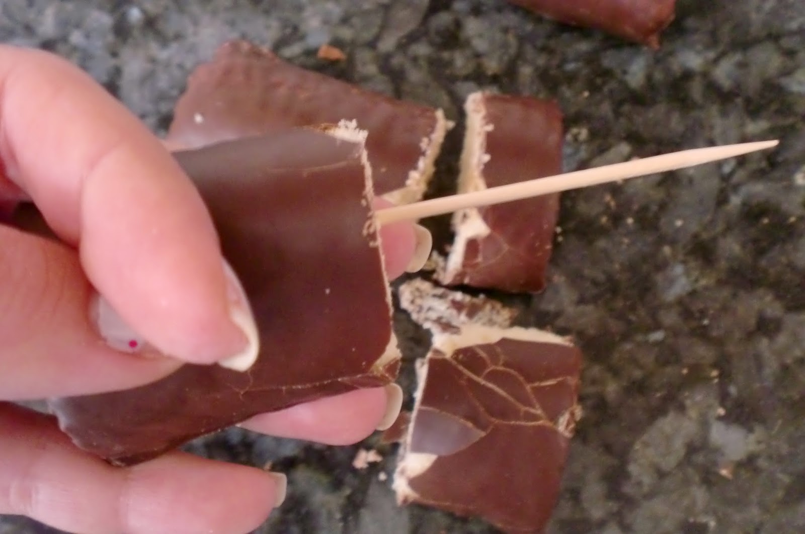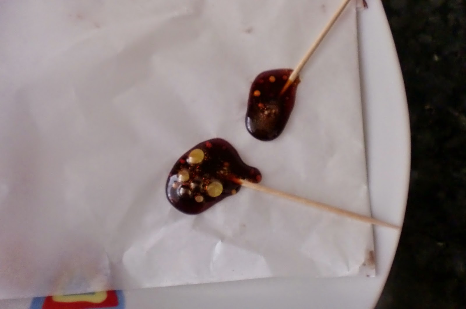 Disponemos un palillo en un plato y vertemos caramelo. Dejamos enfriar