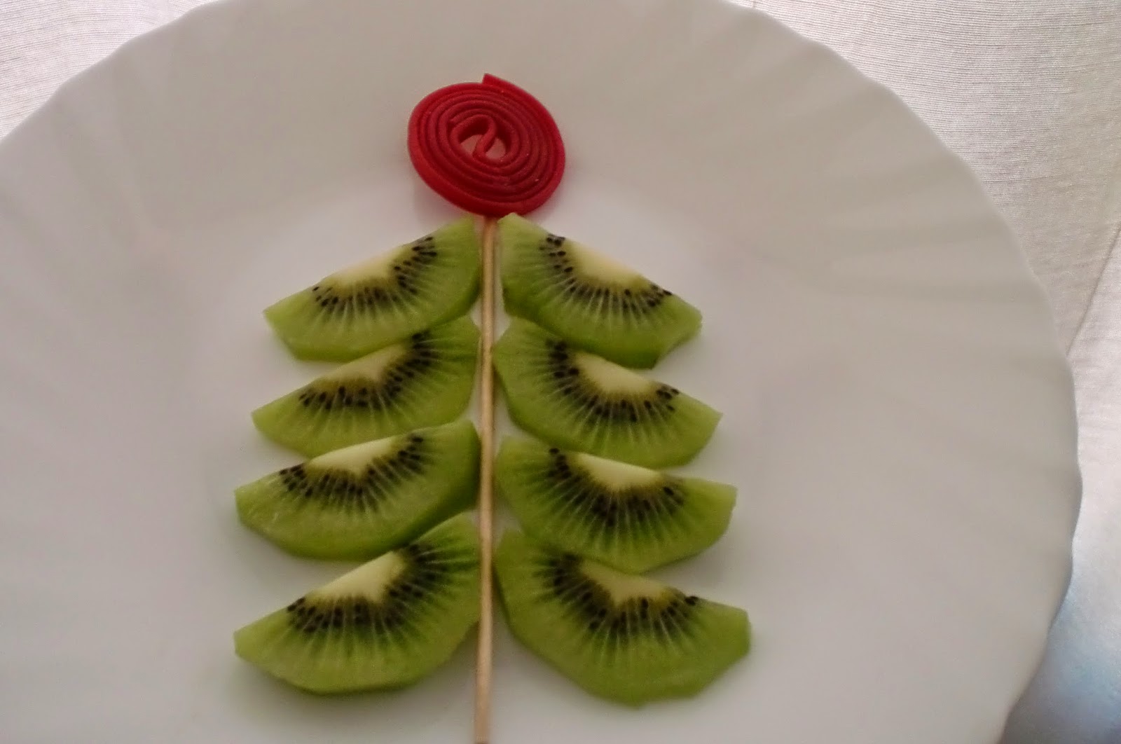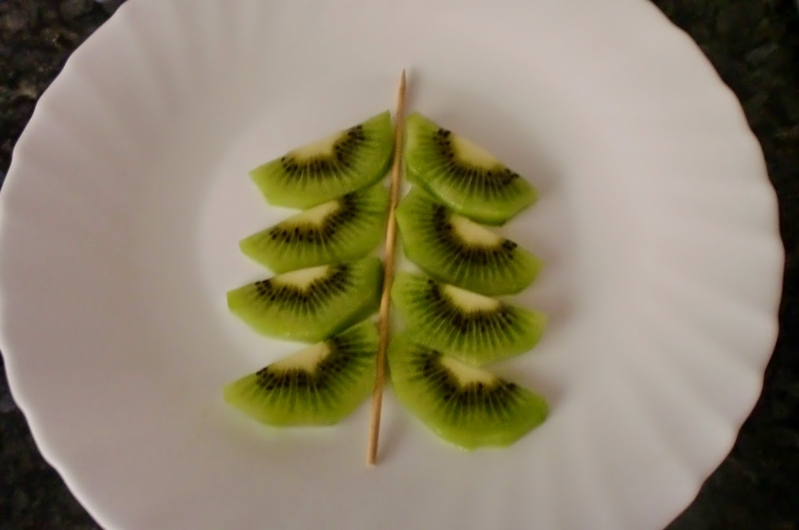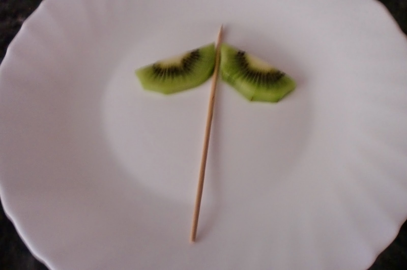 Disponemos el palo de brocheta y vamos colocando las rodajitas de kiwi.