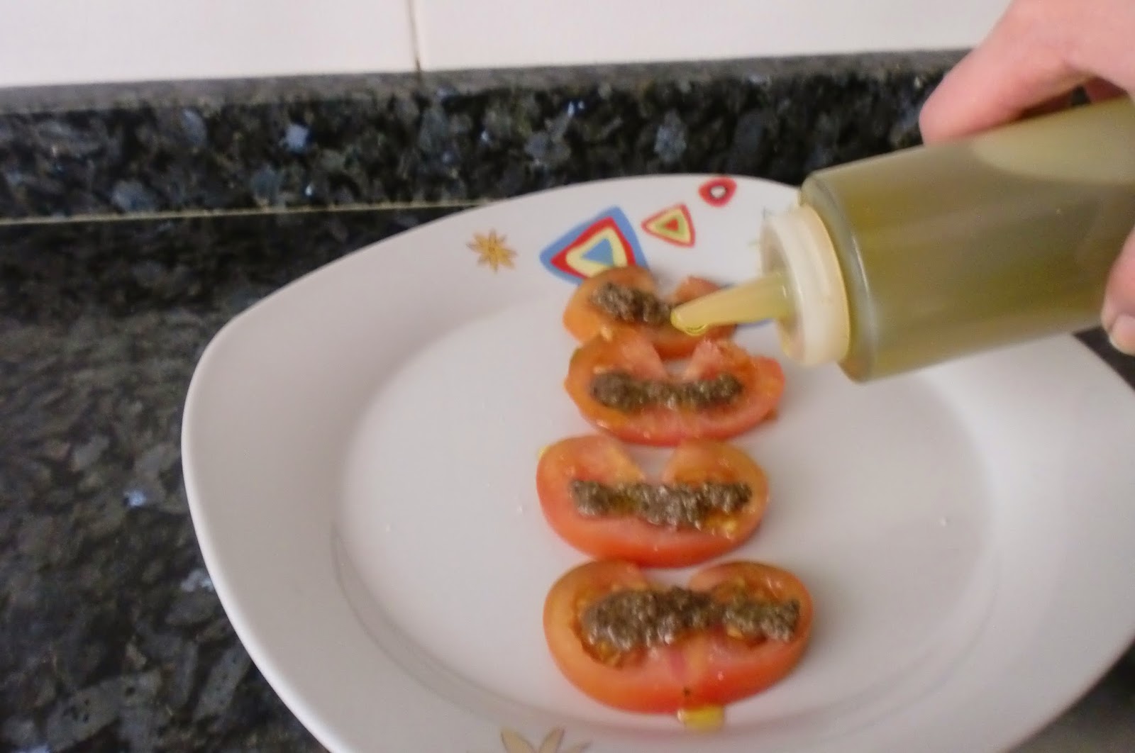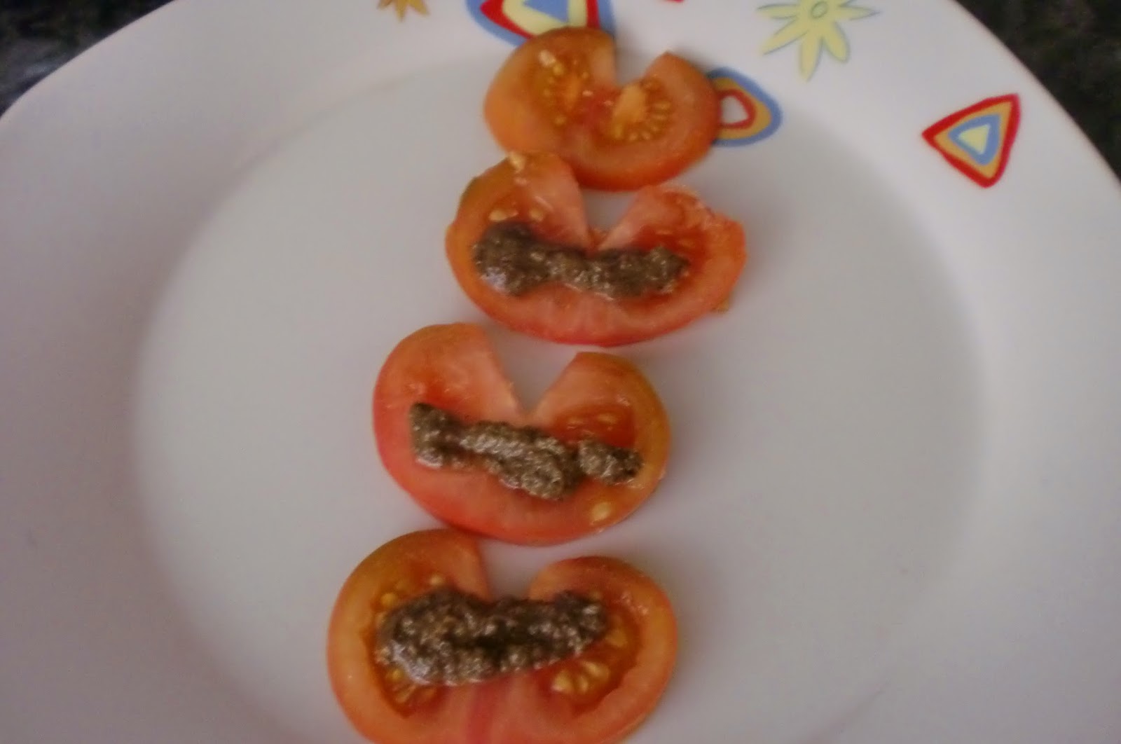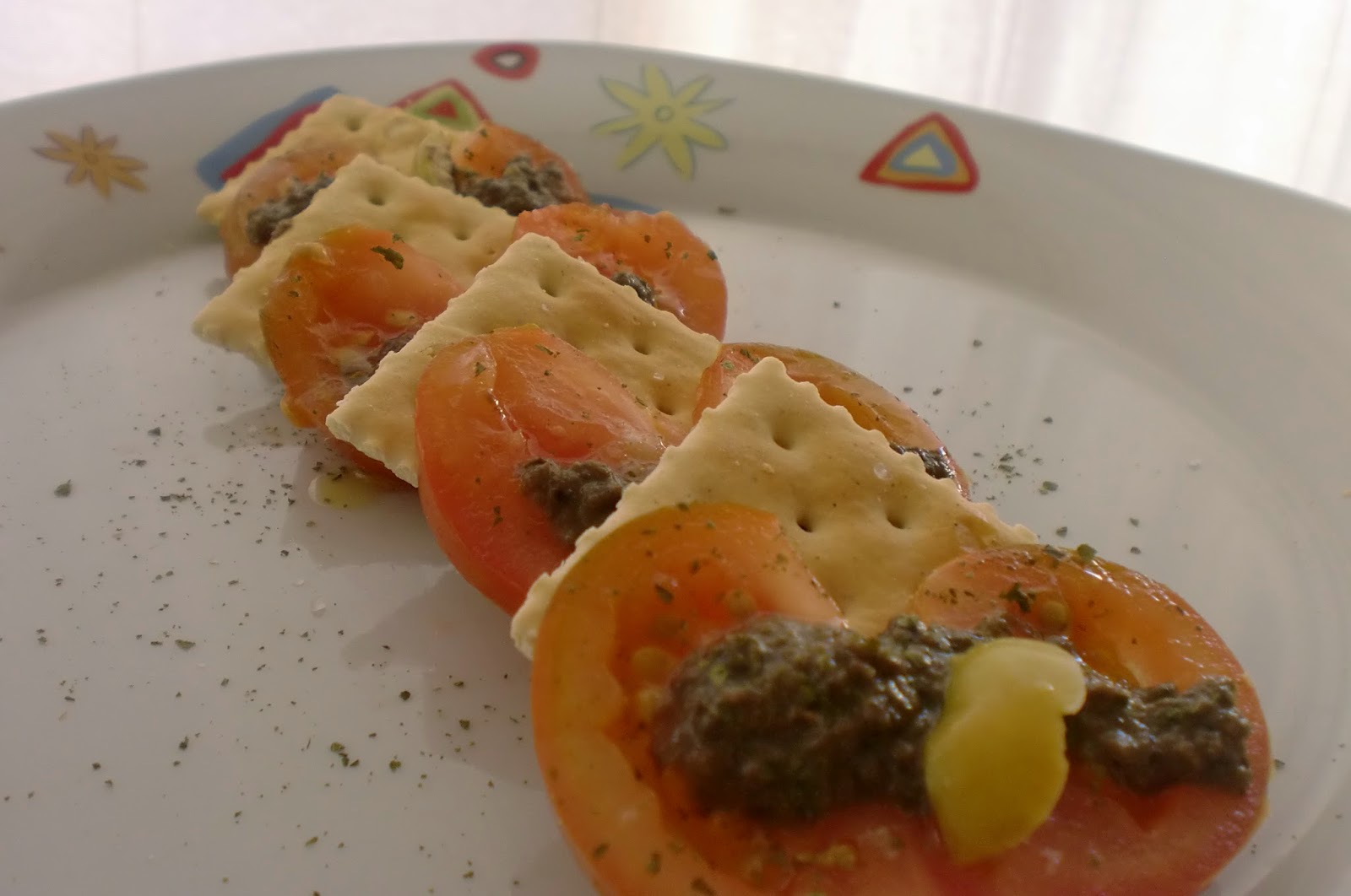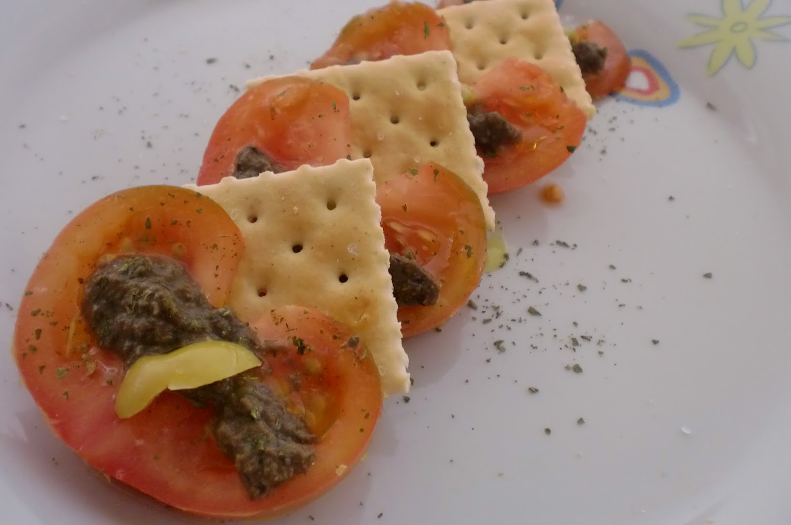 CANAPES DE TOMATE Y PATE DE ACEITUNAS Y BERENJENAS