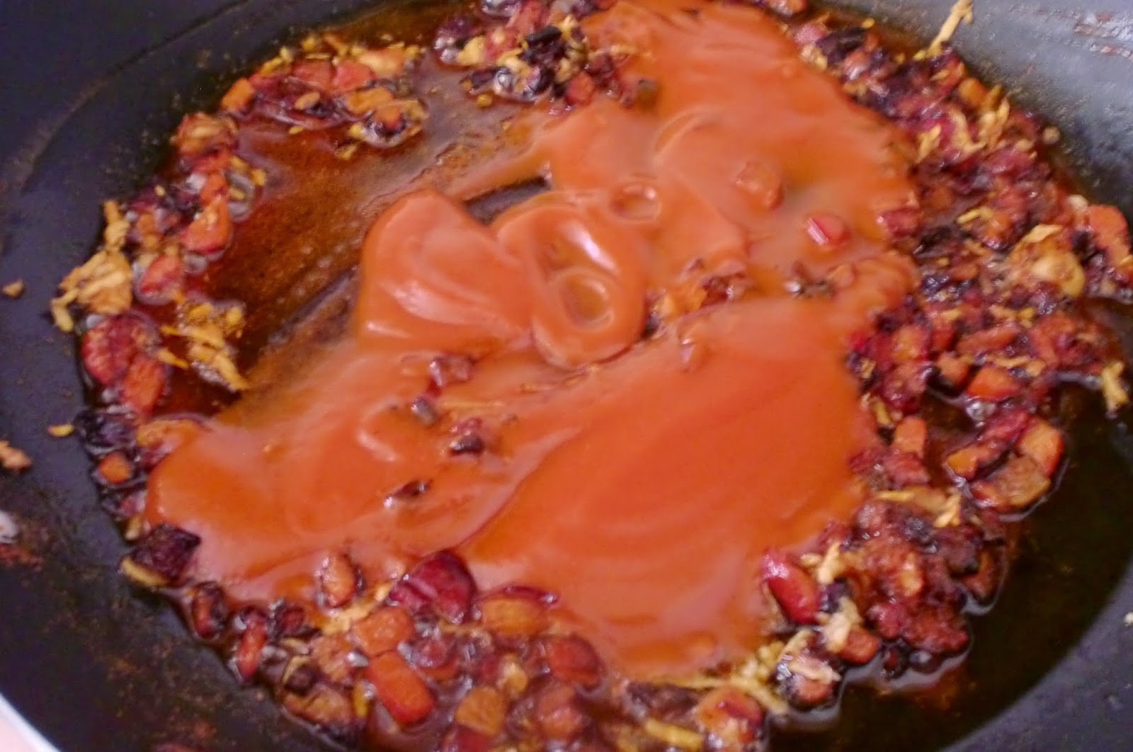 vertemos el tomate frito y la salmorreta y rehogamos un par de minutos