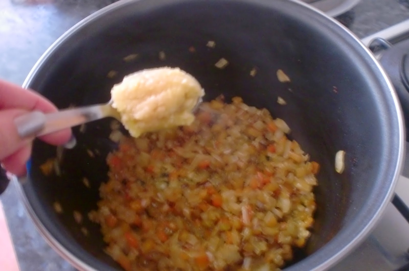 Cuando este bien pochada añadimos los ajos machacados y sofreimos.