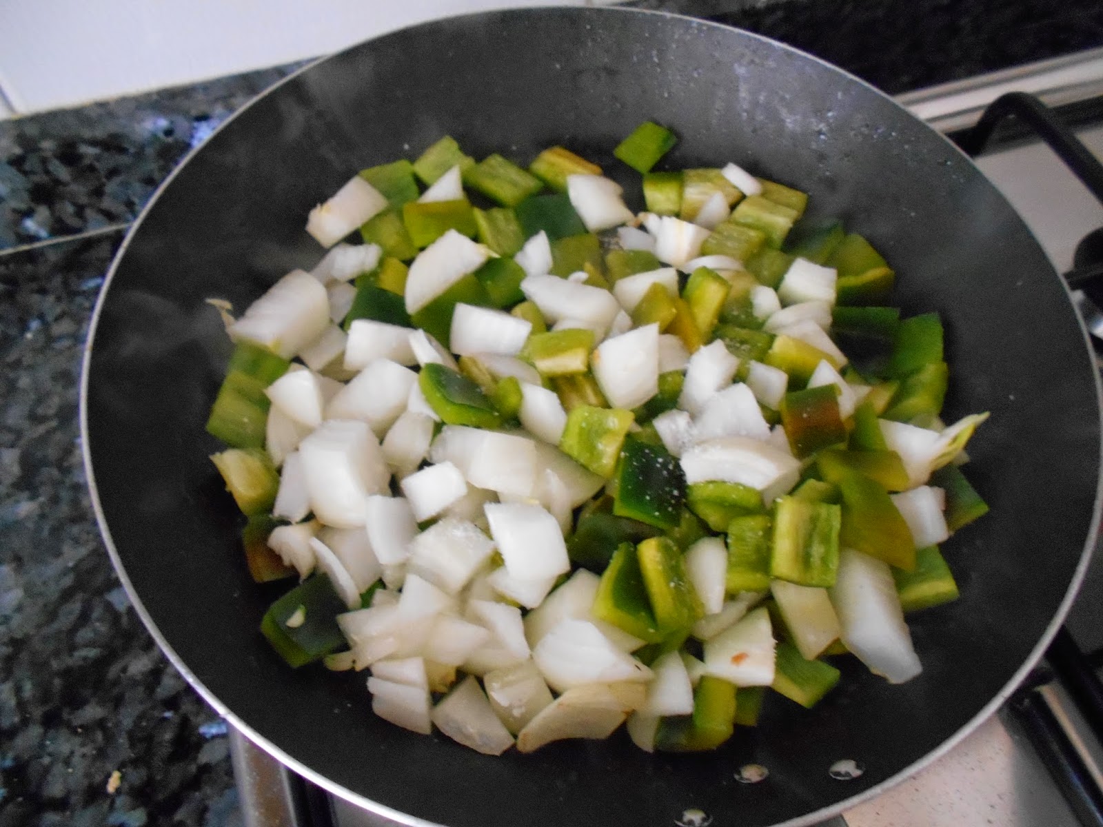 Cortamos la cebolla y los pimientos en tiras no muy gruesas.
