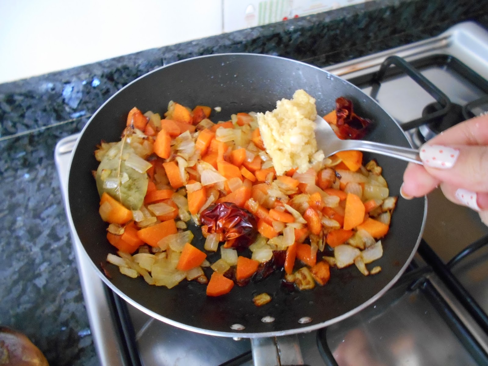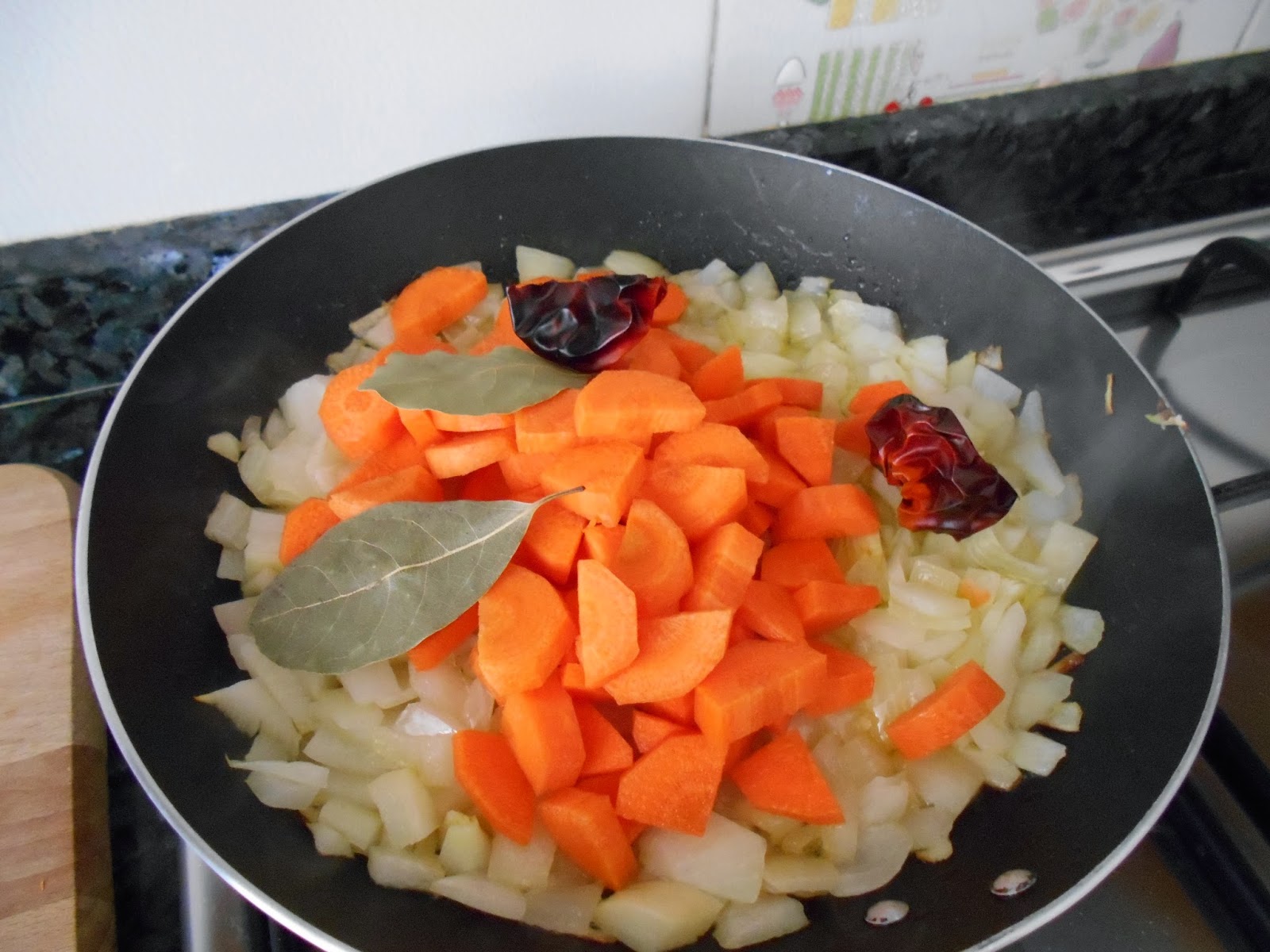Picamos la zanahoria y la añadimos a la cebolla junto con el laurel y la ñora sin pepitas