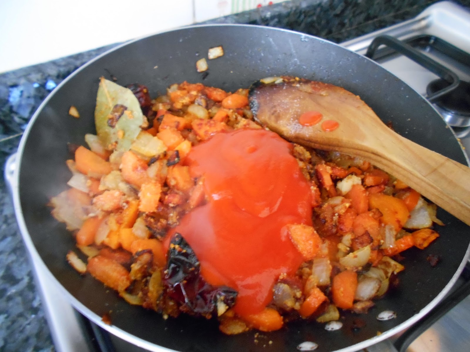 Añadimos los ajos machacados, la almendra molida,  el pimenton y el tomate frito