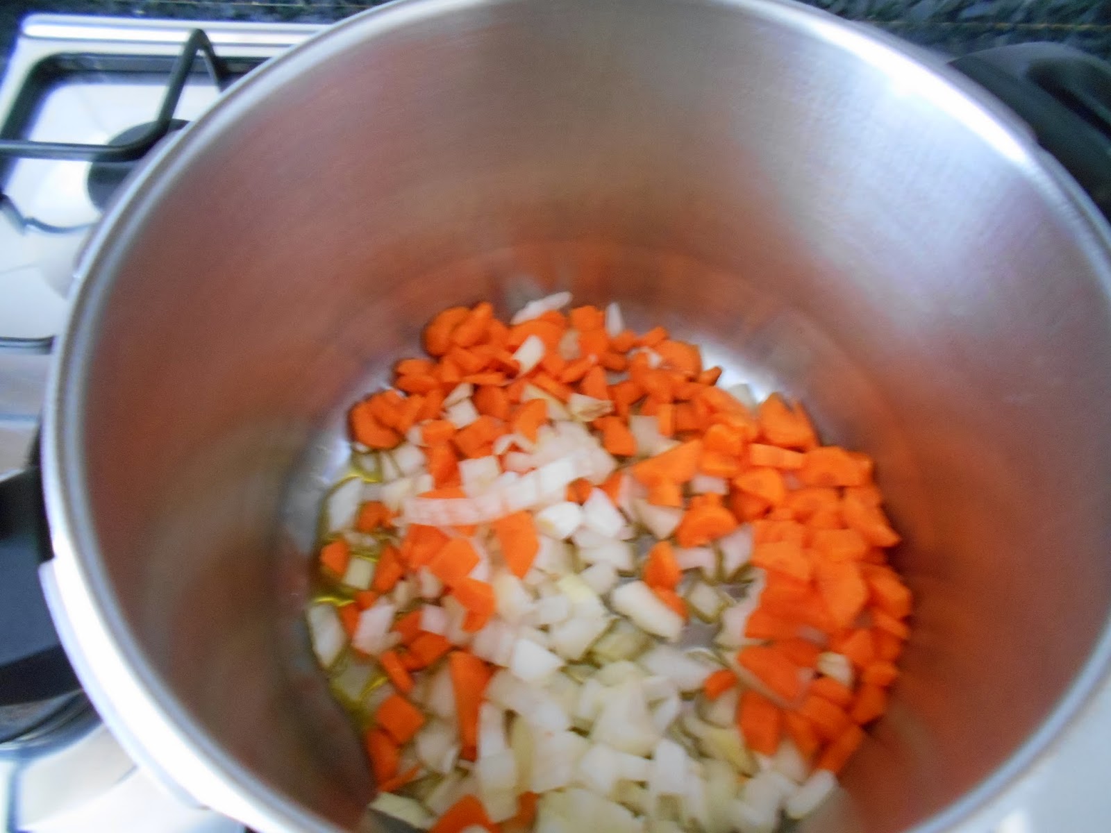 En una olla con aceite rehogaremos la cebolla y la zanahoria.