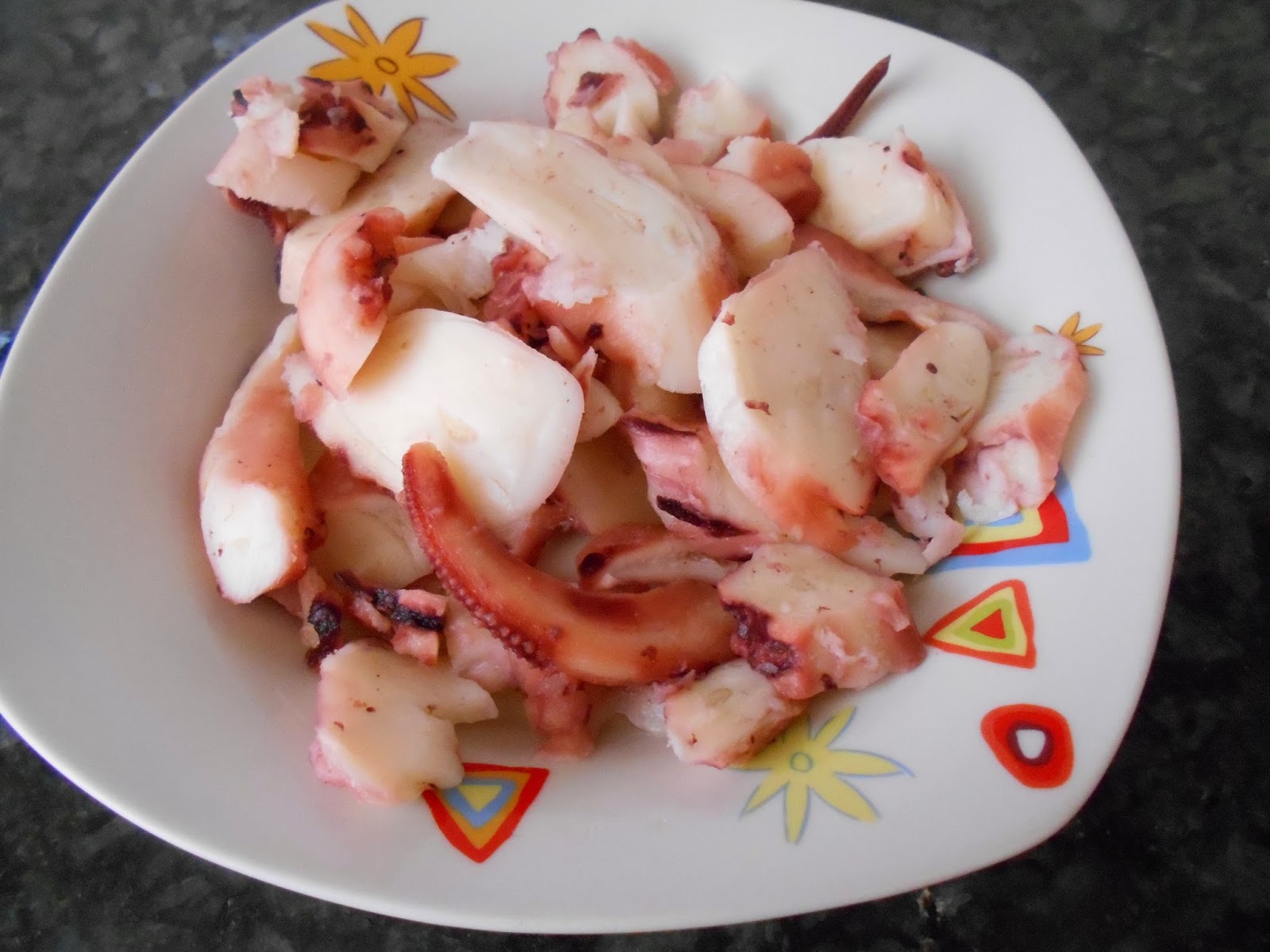 Cocemos el pulpo, cortamos y reservamos tambien el agua de cocerlo
