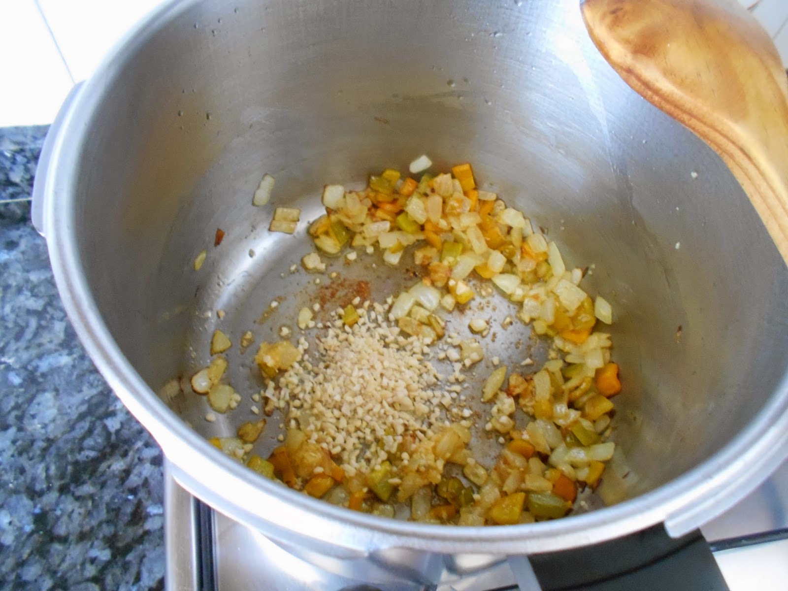 En la olla expres sofreiremos la cebolla y el pimiento.
