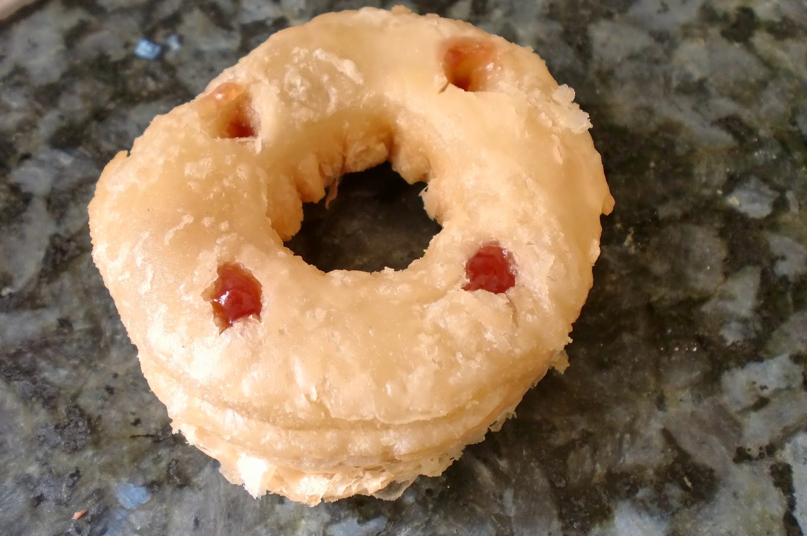 Hacemos unos cortes al cronut con un cuchillo. Rellenamos con la mermelada de fresa, podeis ayudaros de una jeringa o una manga pastelera con boquilla fina.