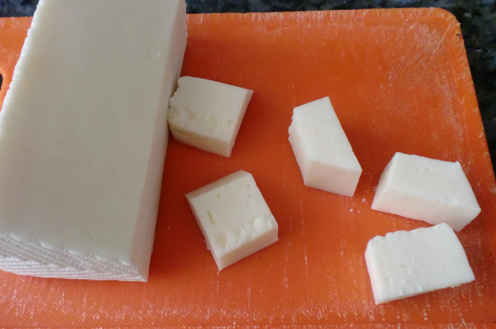 Para conservar queso con aceite de oliva, el primer paso es jejeje cortar el queso. Yo lo he cortado en taquitos de bocado, pero podeis hacerlo al gusto (bastones o cuadrados).
