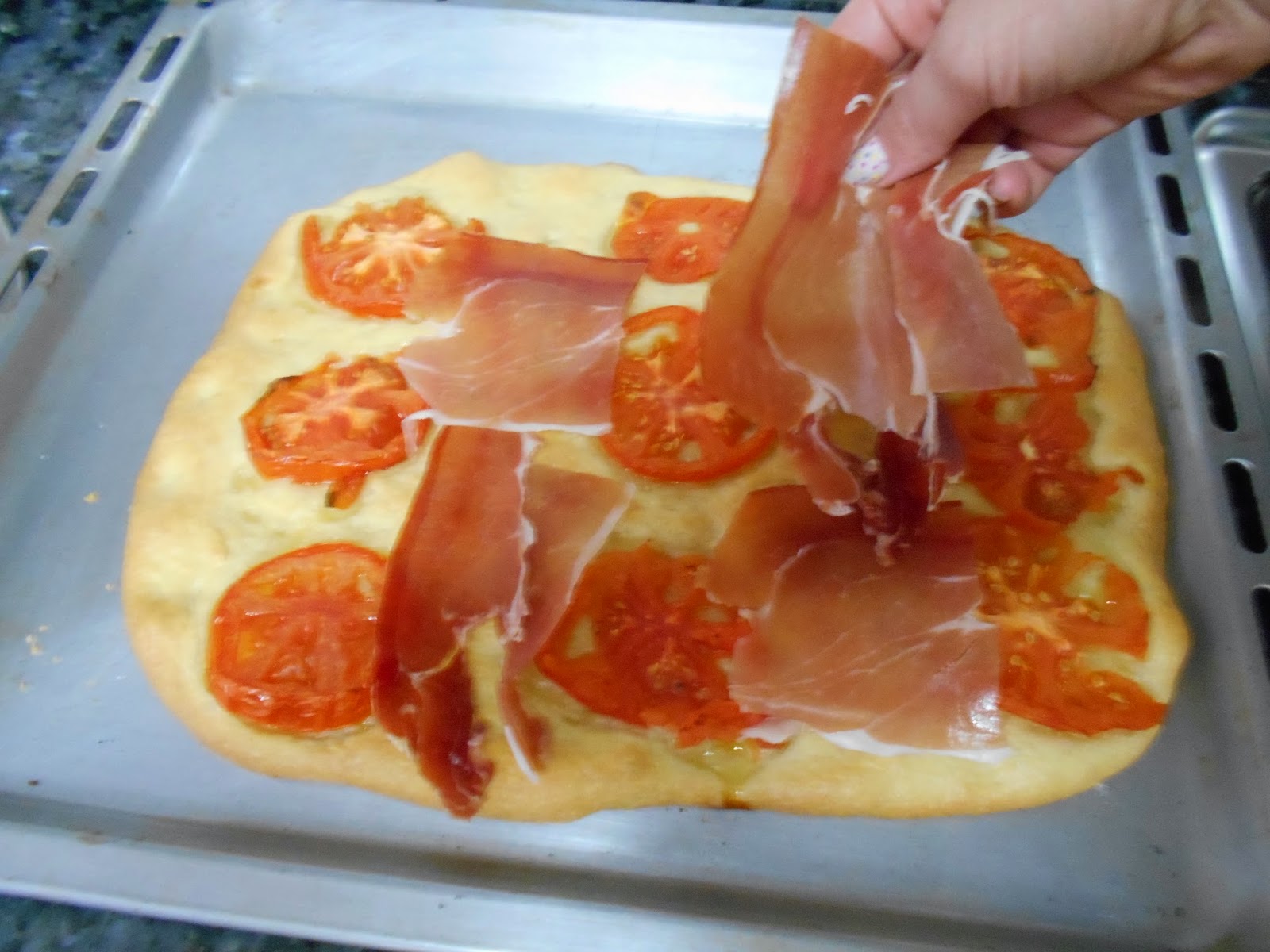 Como sabeis una coca no es más que un tipo de pan de aceite plano y que por tanto podeis añadirle los ingredientes que más os gusten, (longanizas, morcillas, anchoas, sardinas, verduras, carne, pizza…) en el caso de hoy van jamon serrano y tomate.