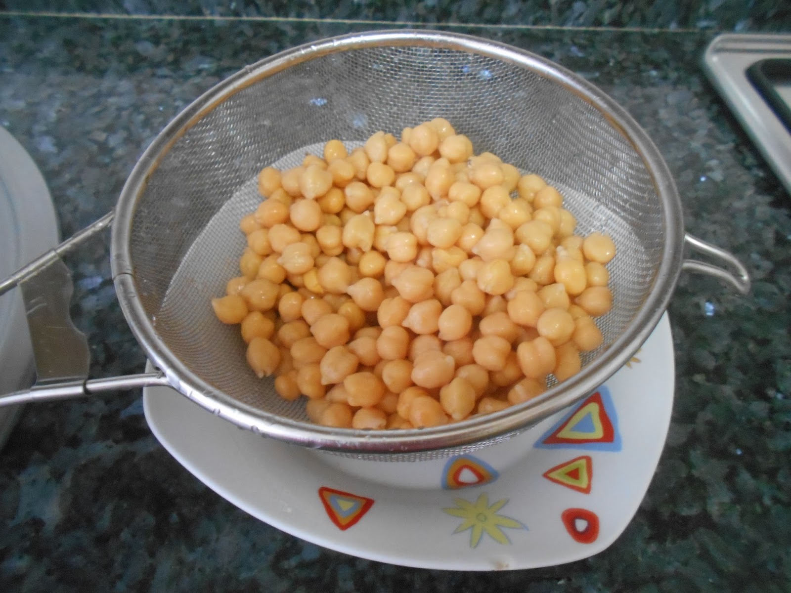 Escurrimos los garbanzos del bote y los enjuagamos muy bien para quitarles todo el sabor «de bote».