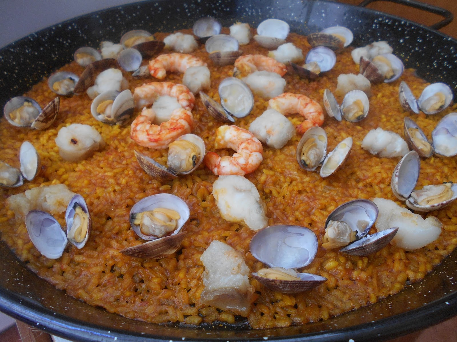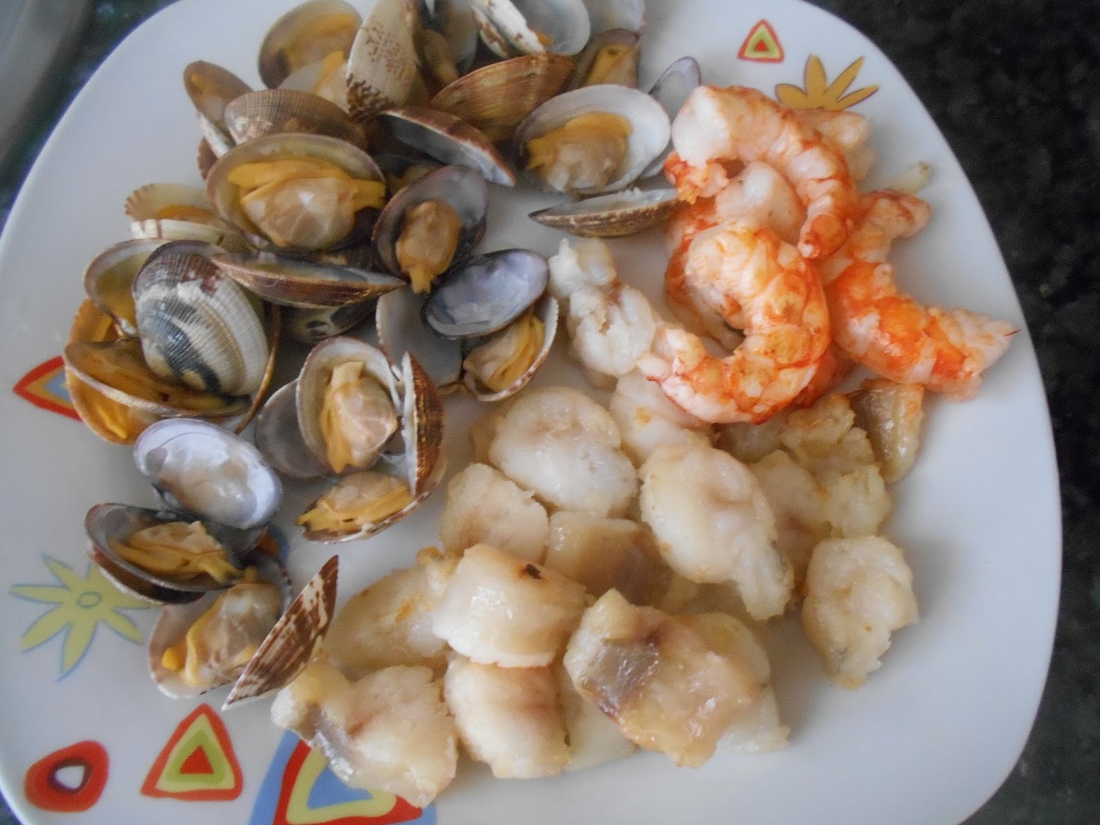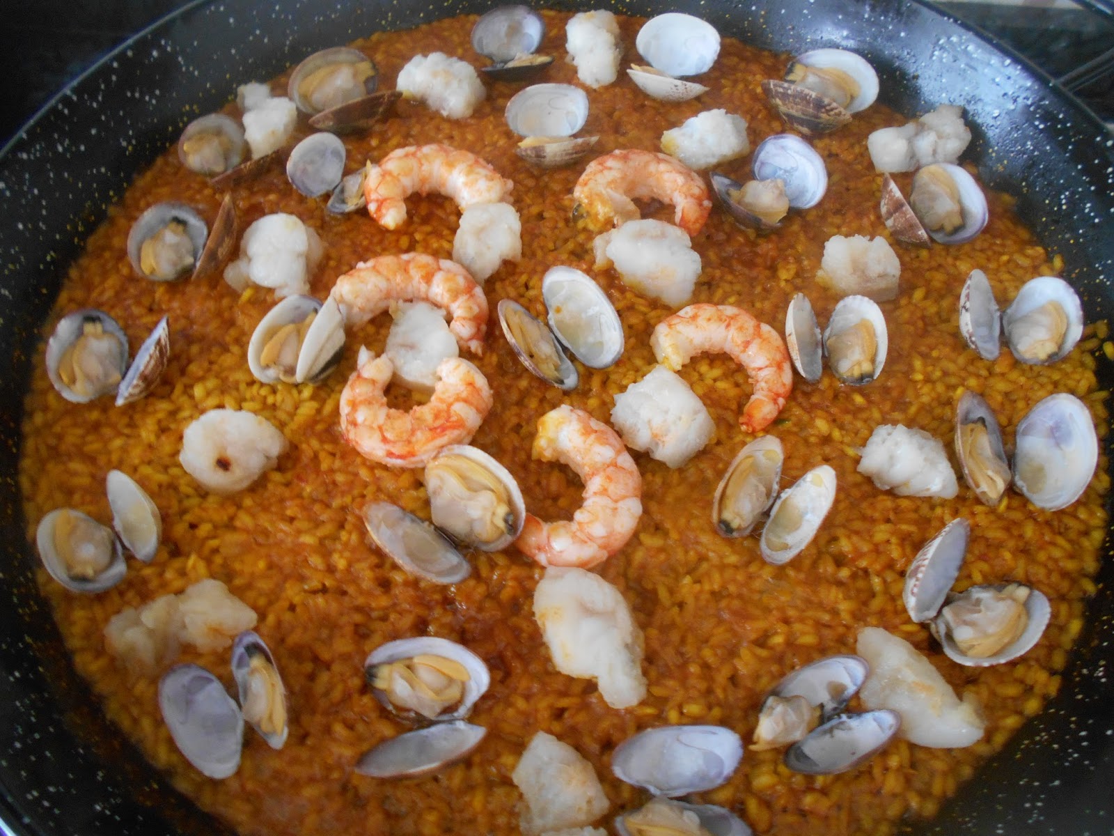 Añadimos el rape, los gambones y las almejas y dejamos terminar el arroz 5 min más