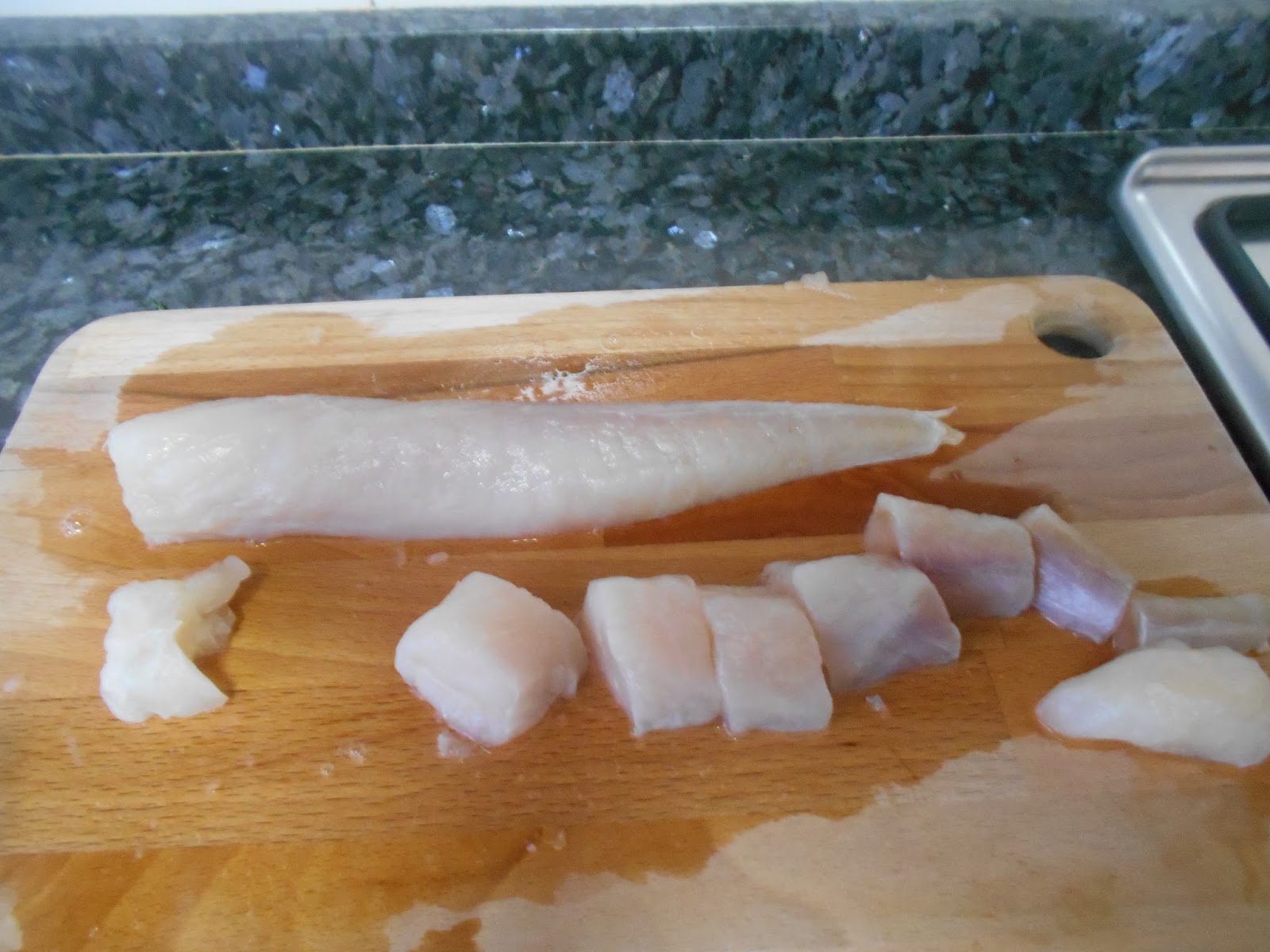 limpiamos el rape, sacamos los 2 lomos. Cortamos en tacos no muy pequeños y reservamos la espina.