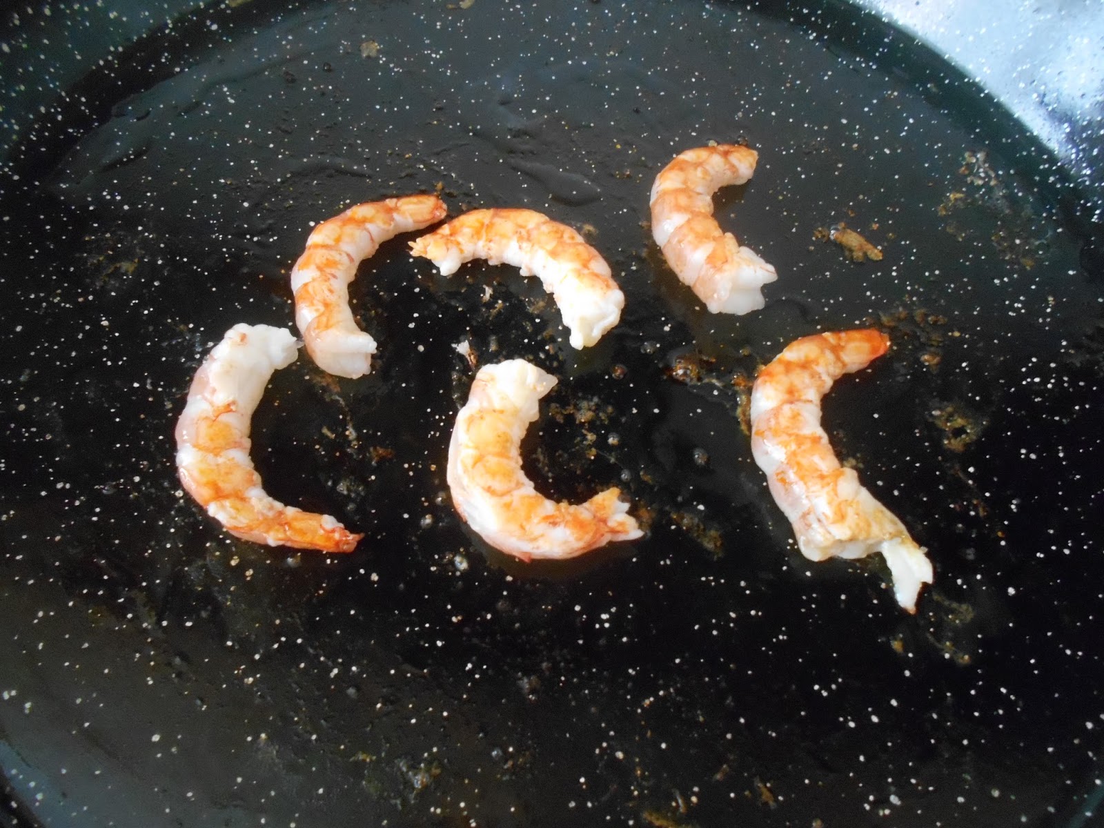 Preparamos un fondo. En una olla echamos un poco de aceite y rehogamos las cabezas y las cáscaras de los gambones. Añadimos el hueso, la cabeza y la piel del rape, perejil y un poco de sal. Cubrimos bien de agua y ponemos a hervir unos 15min.