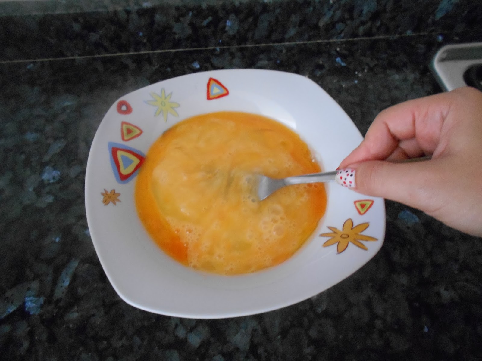 Vertemos esa mezcla sobre los huevos, removemos bien hasta que quede bien mezclado.