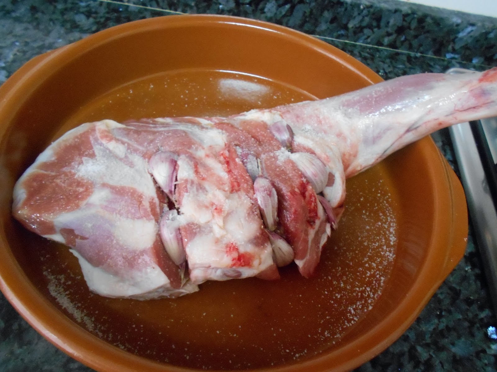 Disponemos la pierna de cordero en una cazuela de barro.