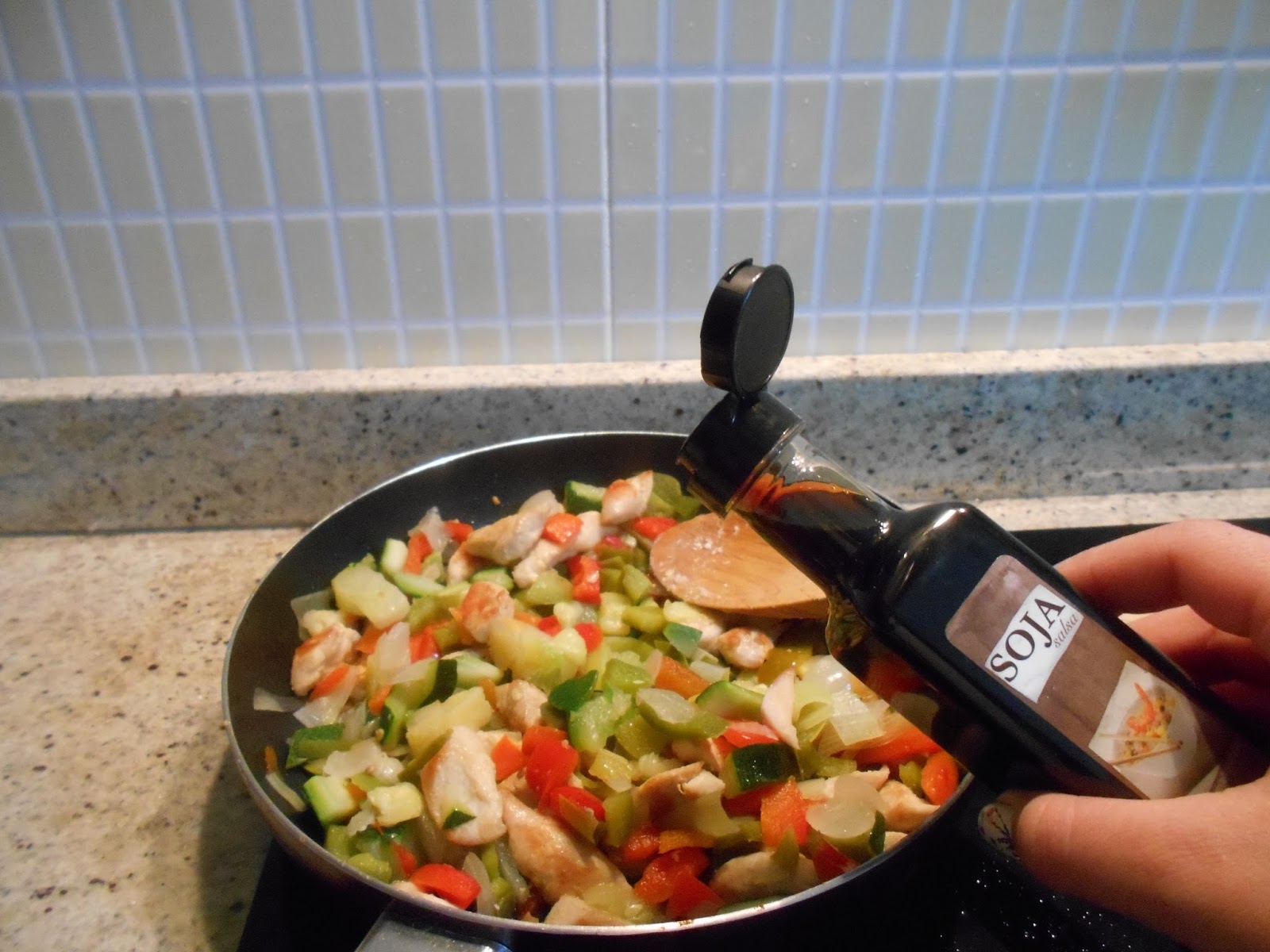 Salteamos el pollo. Añadimos unas verduras y rehogamos un poco, que no queden demasiamo hechas.