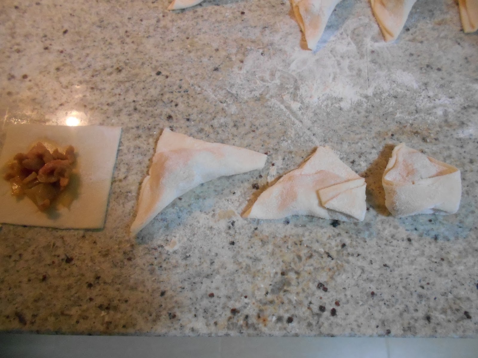 Damos forma al wonton. Yo he elegido hacerlos asi, pero podeis hacerlos como prefirais.
