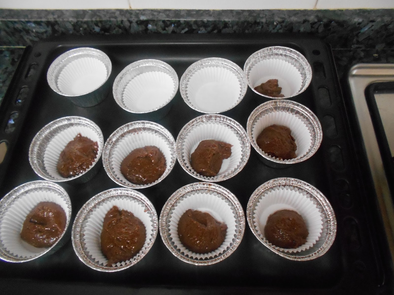 Cogemos porciones de masa con ayuda de unas cucharillas y rellenamos 1/3 del tamaño de la capsula de los muffins.