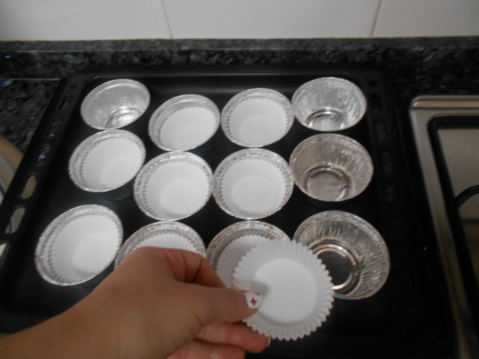 También preparamos las cápsulas de muffins en la bandeja. Yo las pongo dentro de moldes de aluminio.