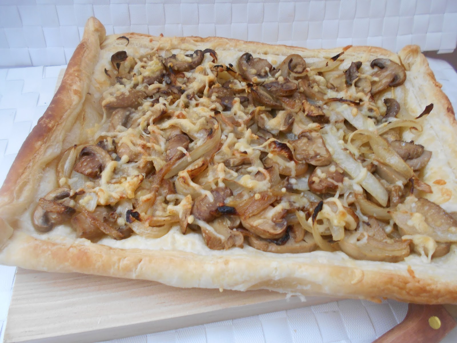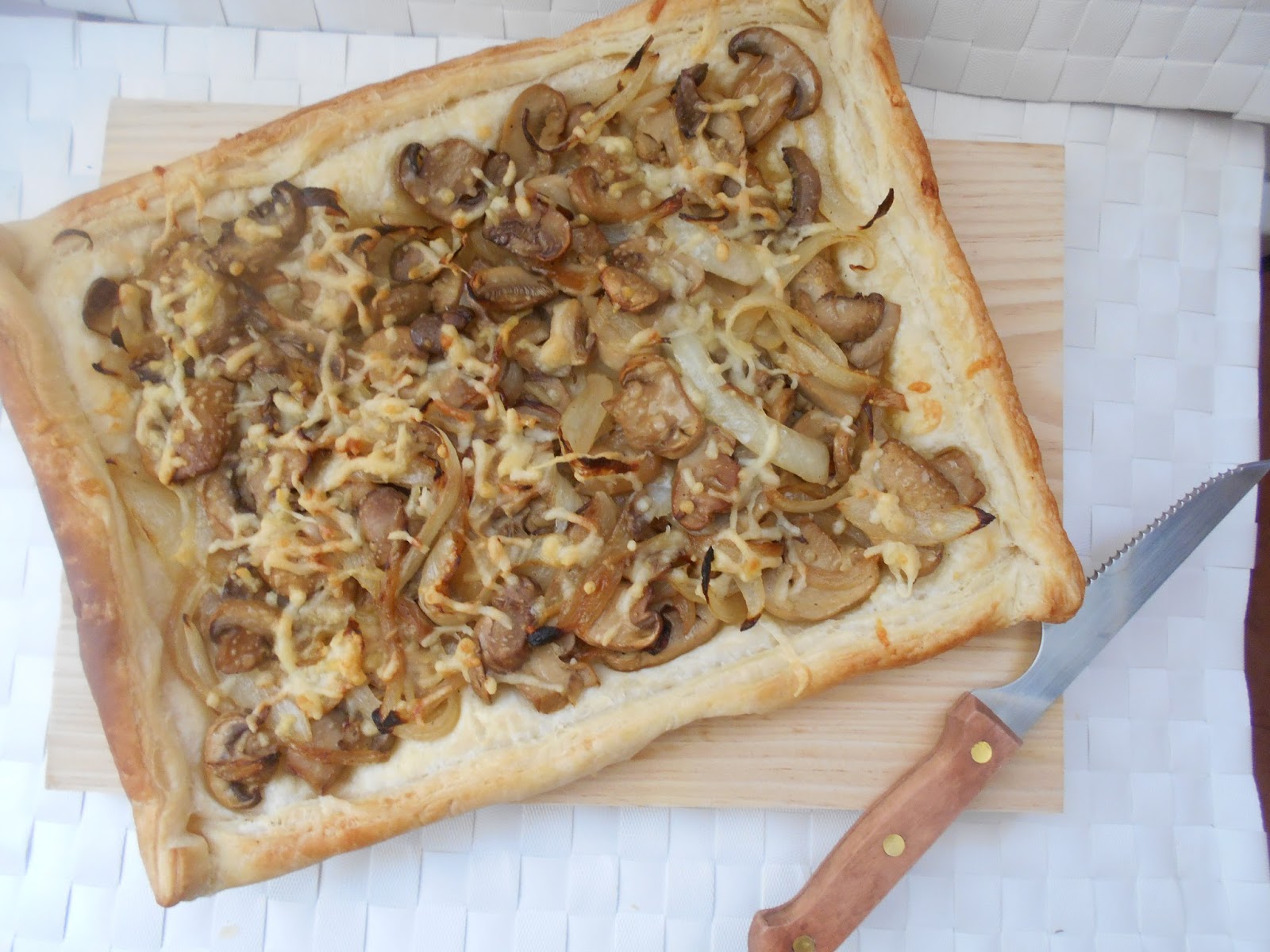 COCA DE HOJALDRE CON CHAMPIÑONES Y CEBOLLA