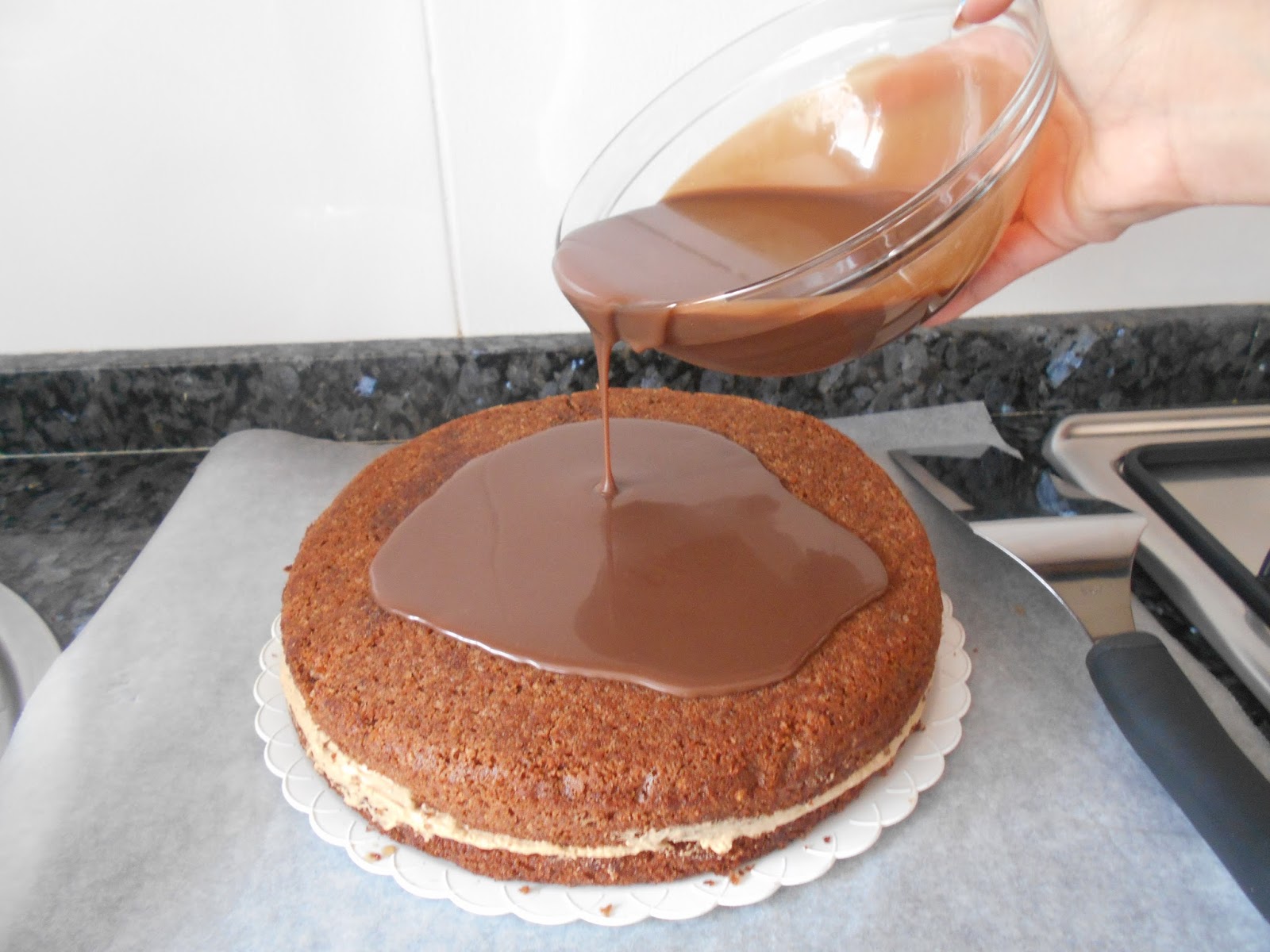 Cuando haya templado vertemos la cobertura sobre la tarta.