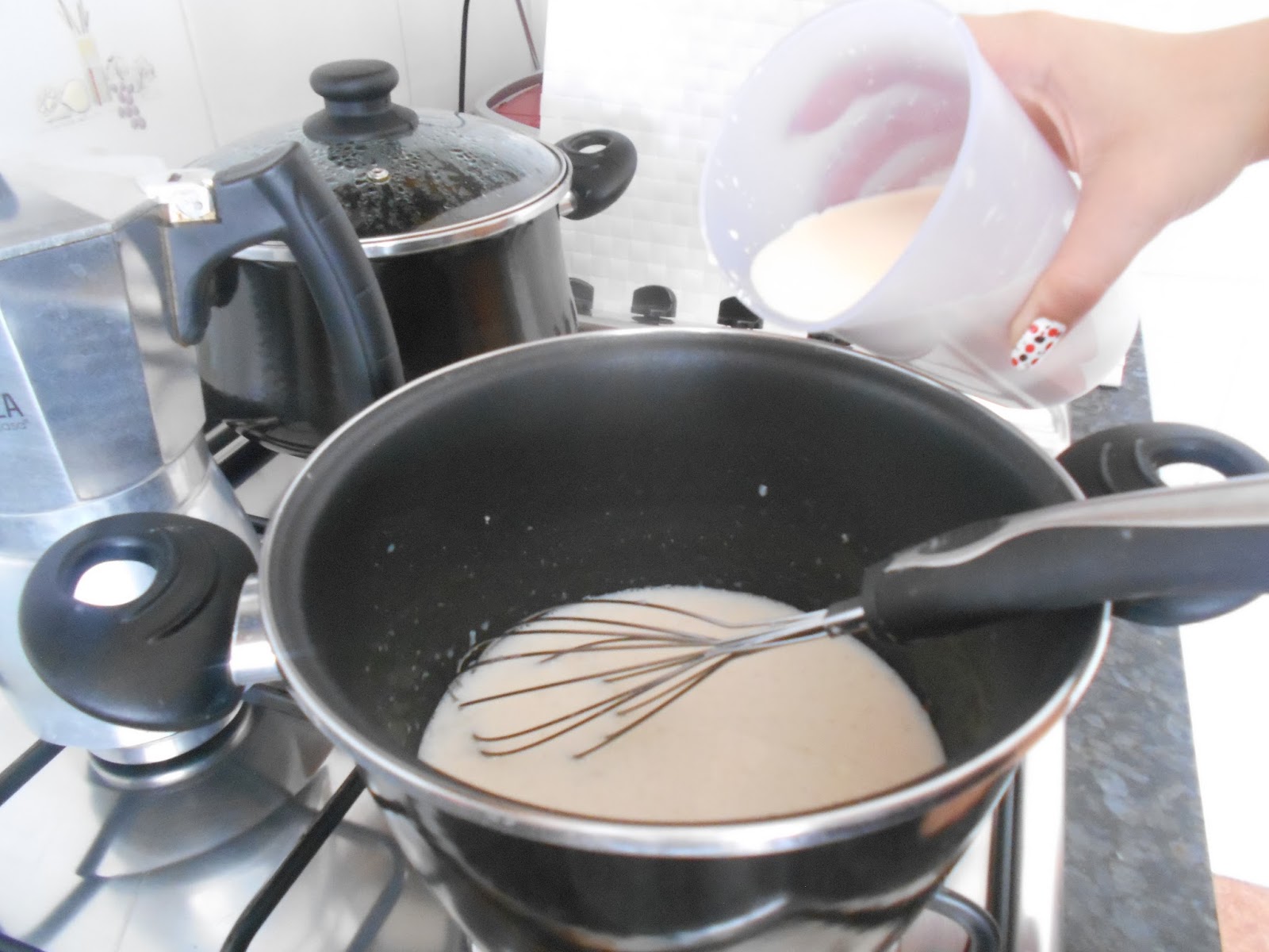 Vertemos poco a poco el batido de nata y huevos sobre la leche preparada.