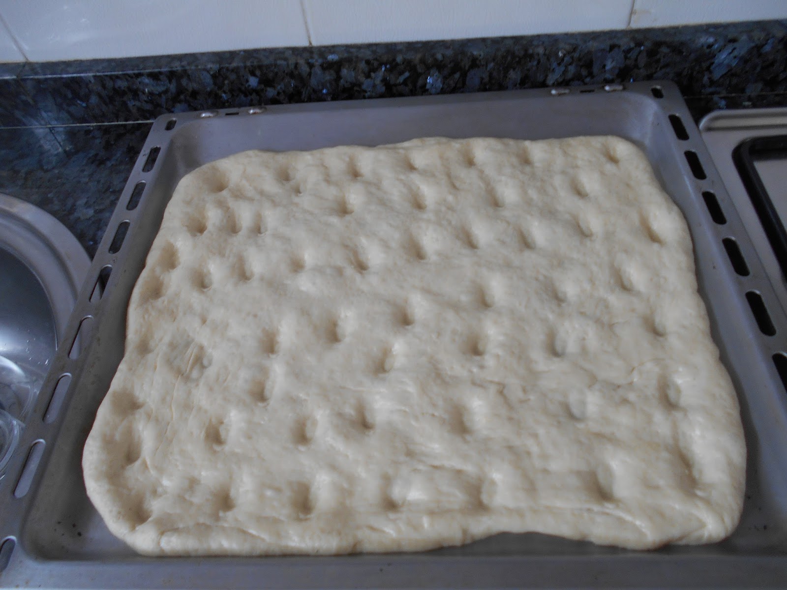 Hacemos las marcas tipicas de una buena coca alicantina. Echamos un poco de sal y aceite.