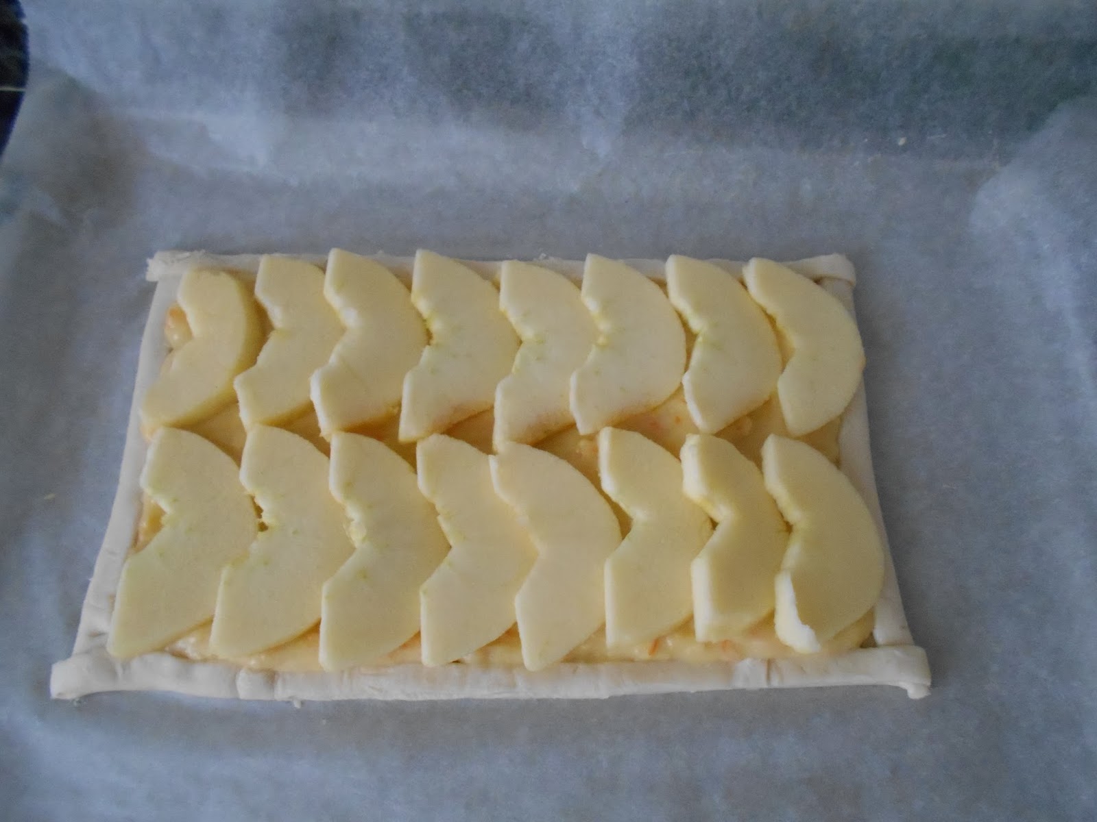 Cortamos la manzana en laminas no muy gruesas. Disponemos la manzana sobre la crema pastelera.
