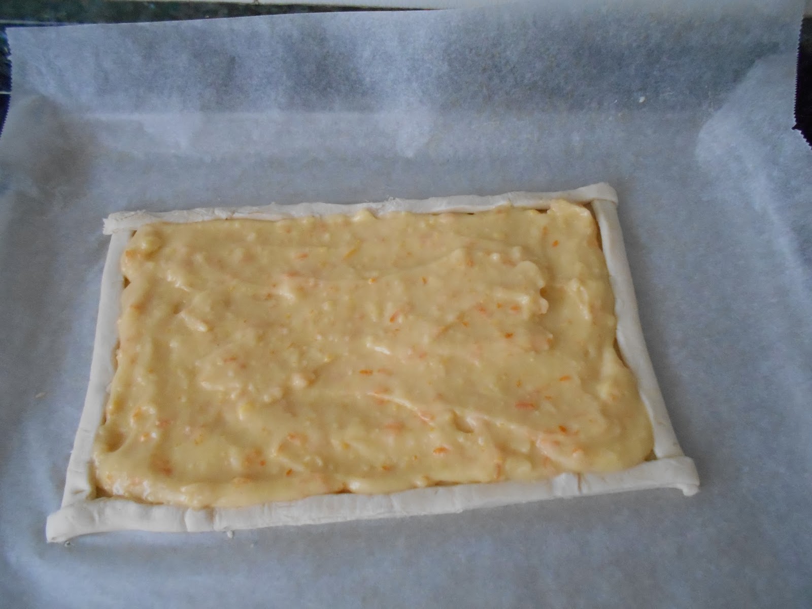 Una vez la tengamos lista cogemos la lámina de hojaldre y la extendemos en una bandeja de horno, en la que previamente habremos puesto papel de hornear.
