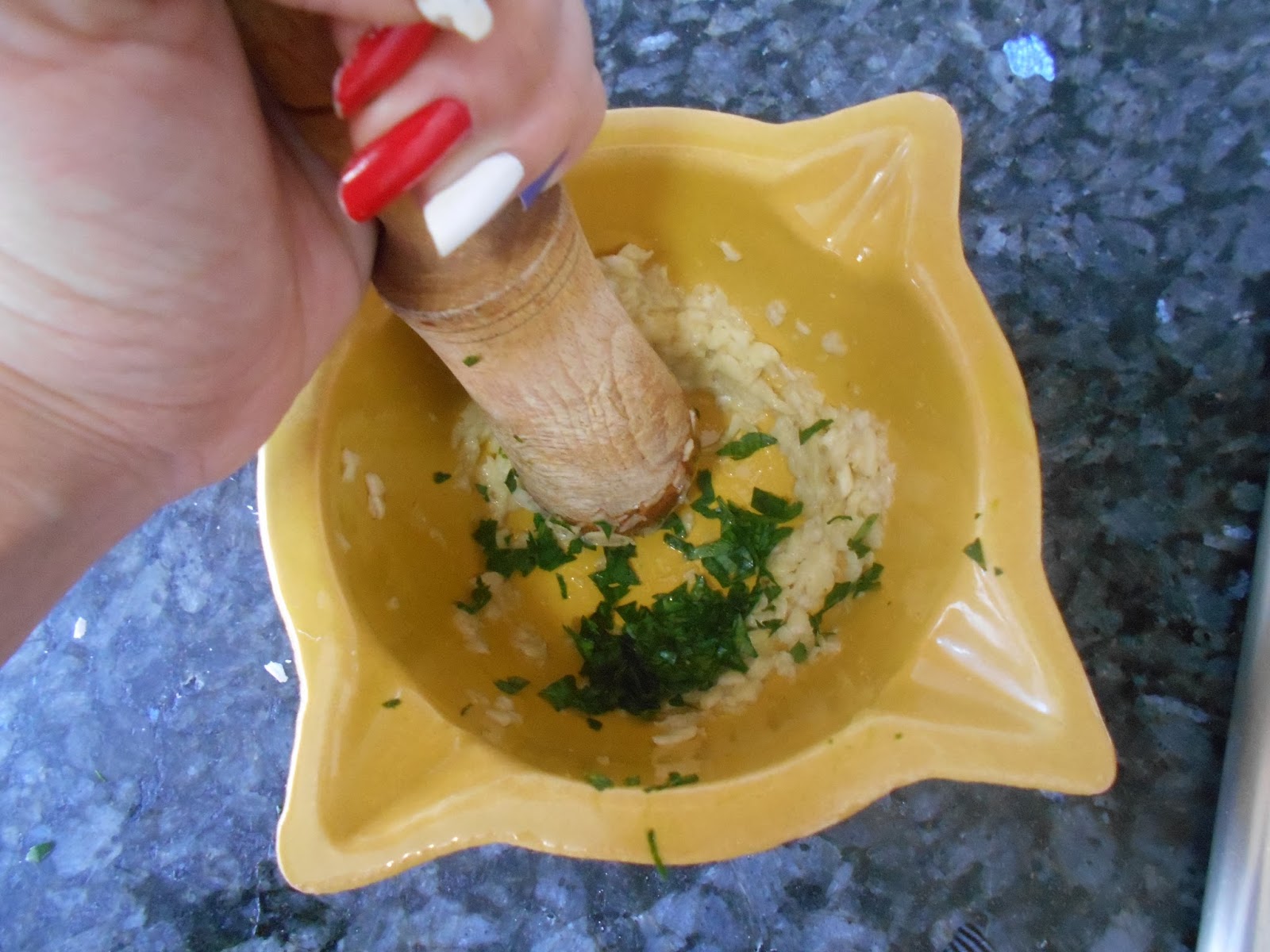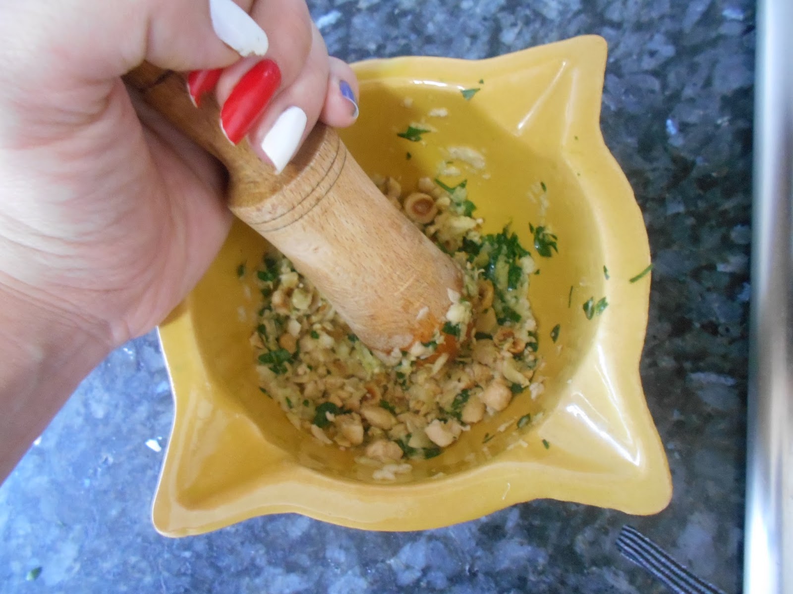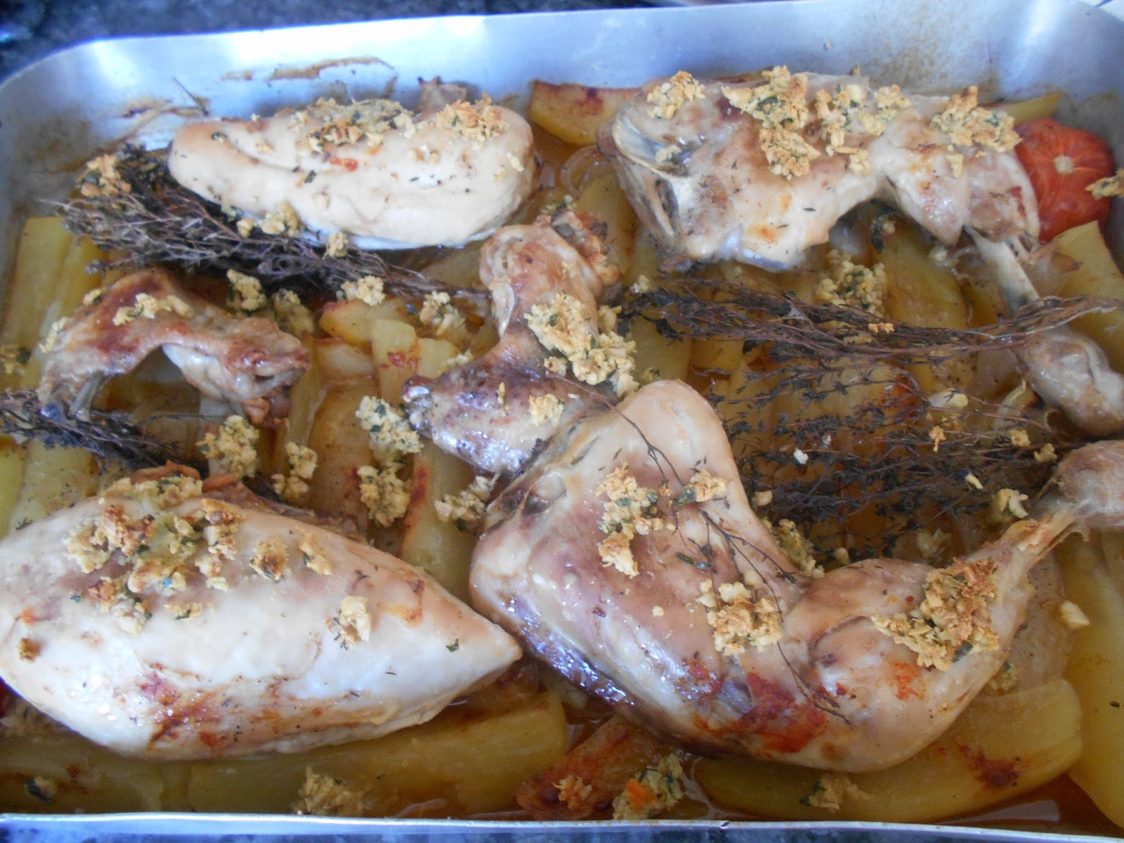 Sacamos la bandeja del horno. Le damos la vuelta al pollo y añadimos la picada por encima.