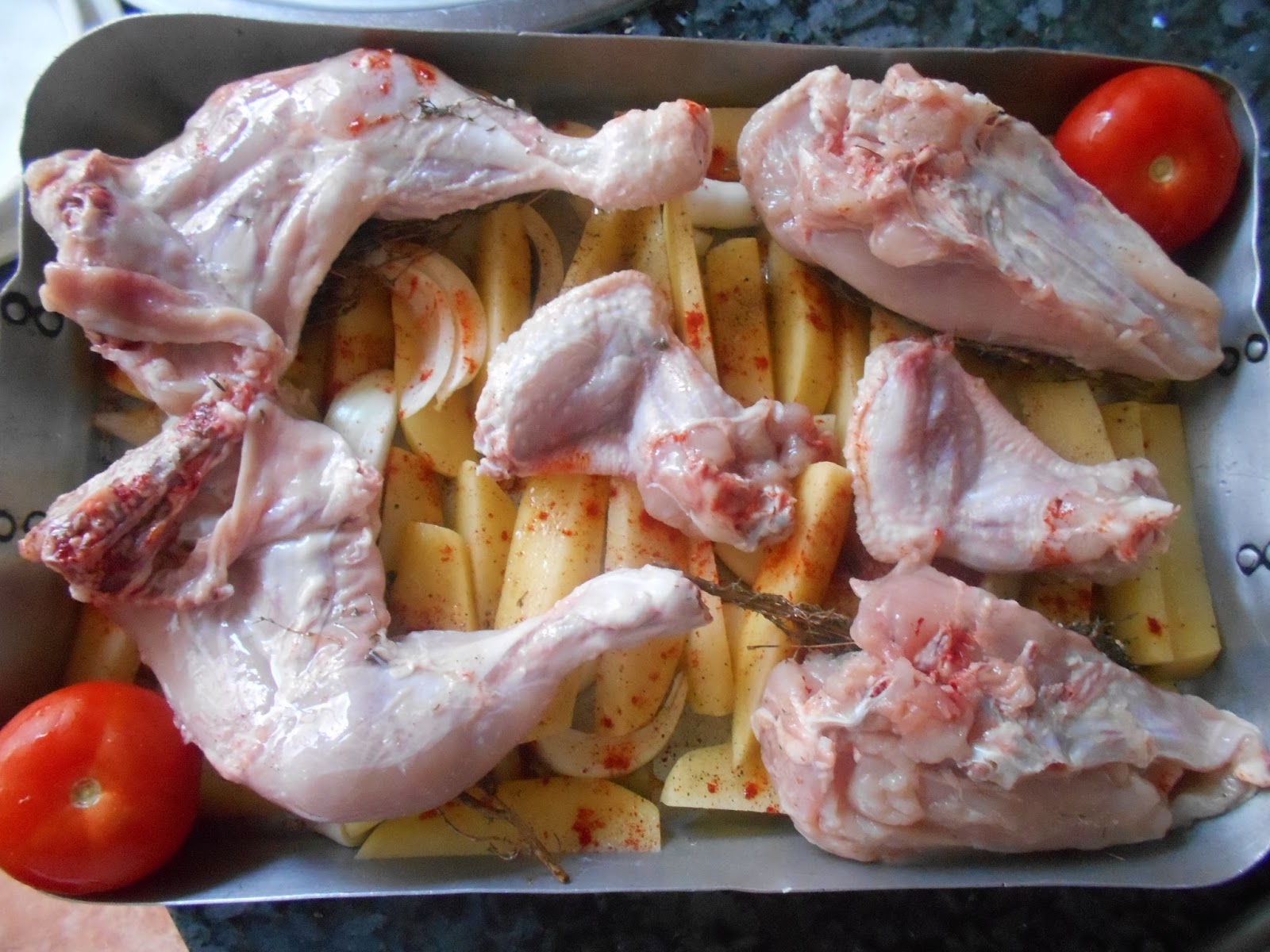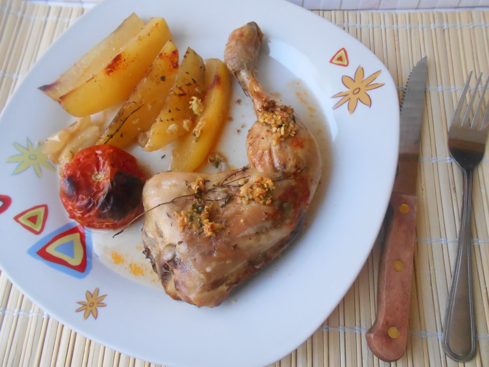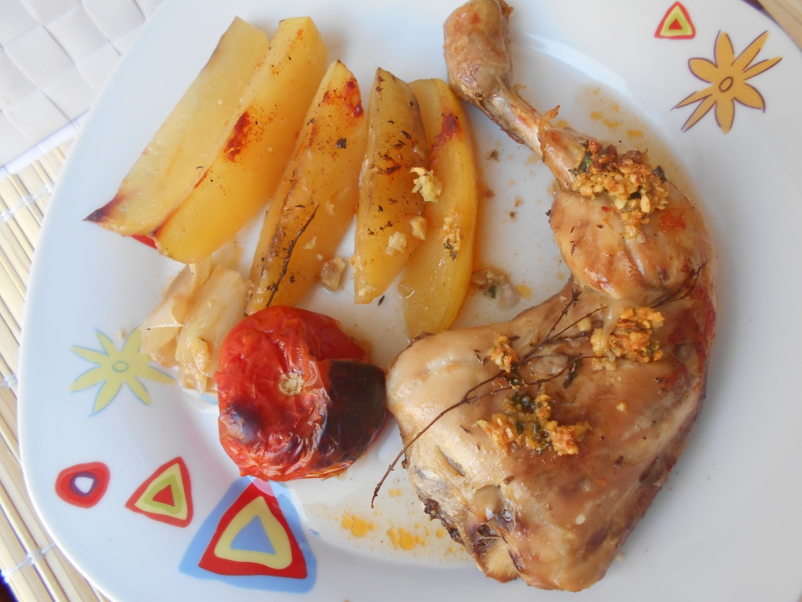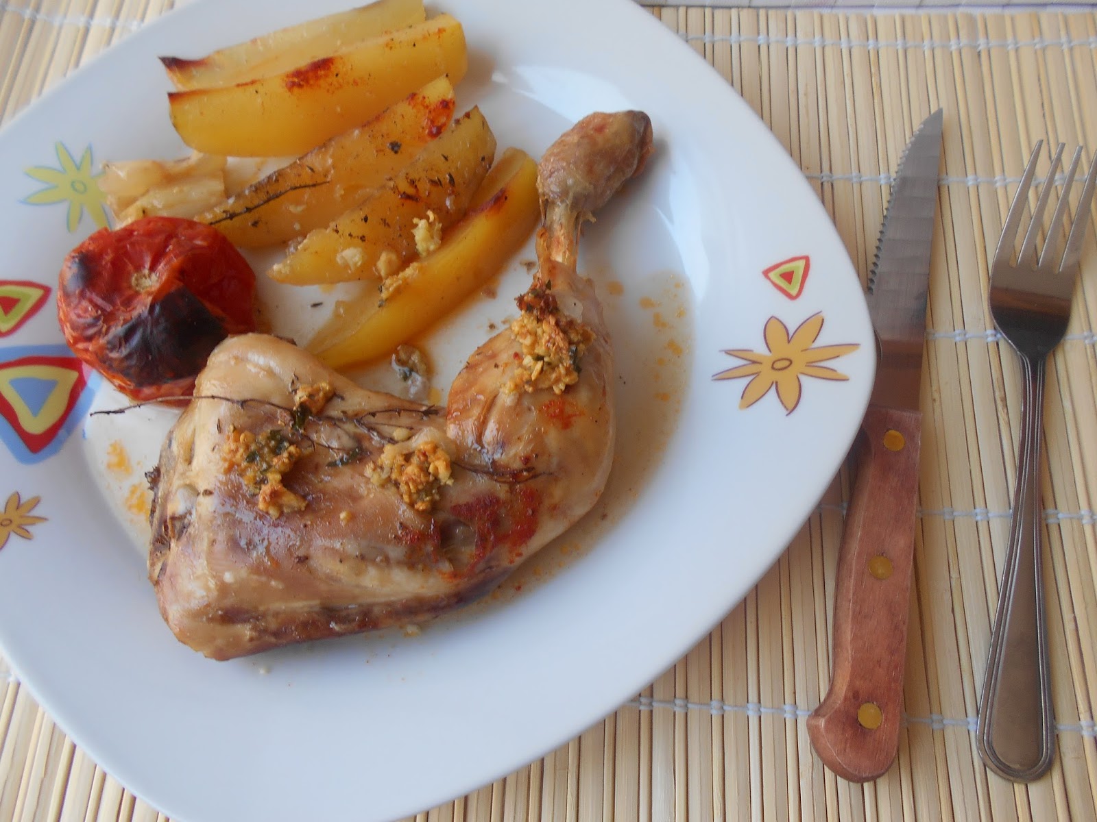 Retiramos del horno, y servimos el pollo acompañado de la guarnición de patatas, cebolla y tomate.