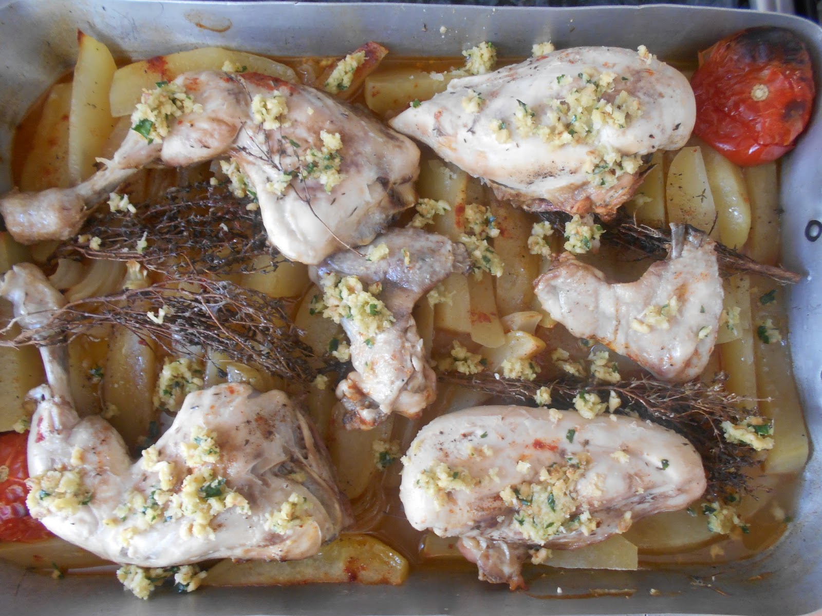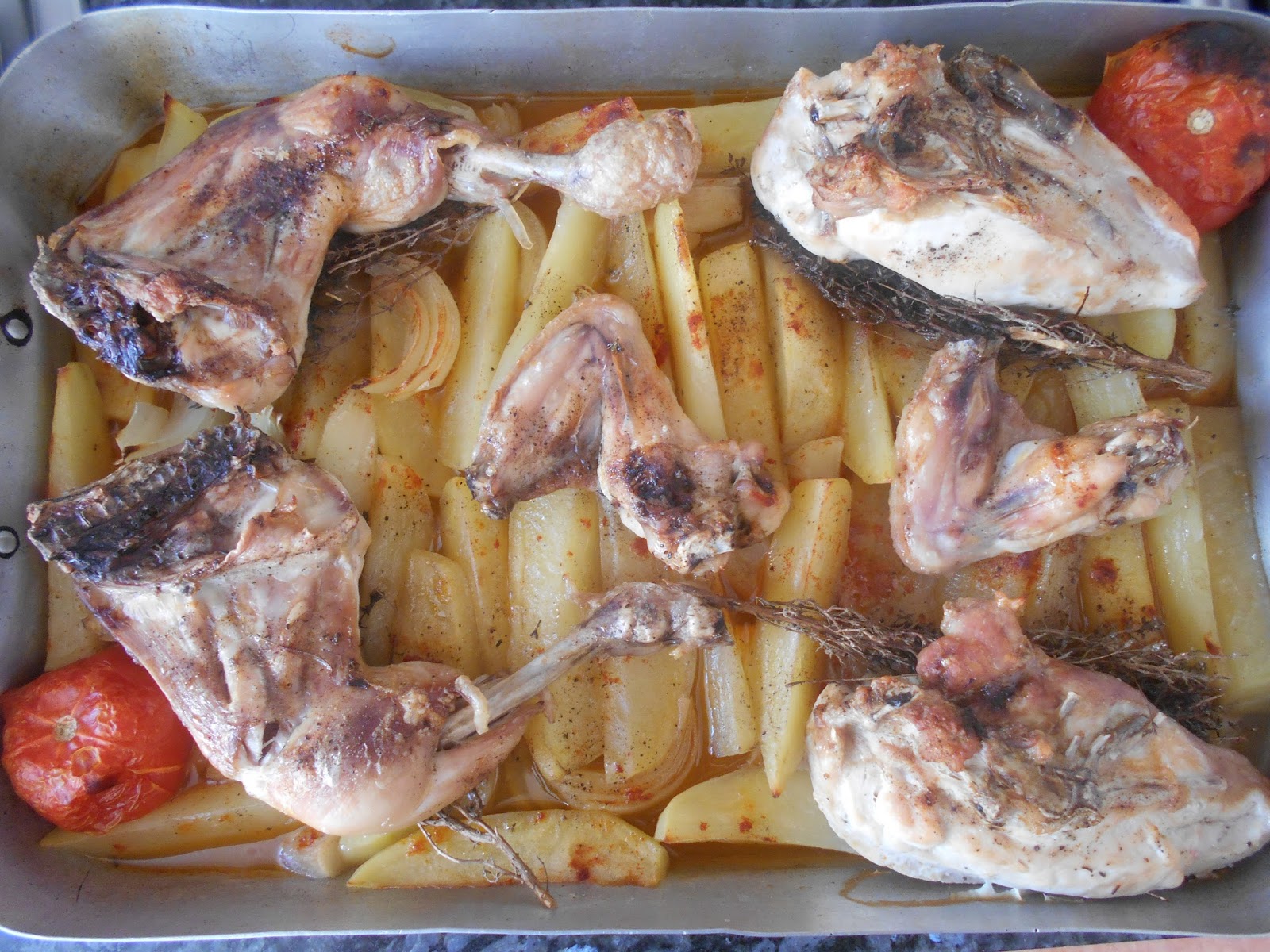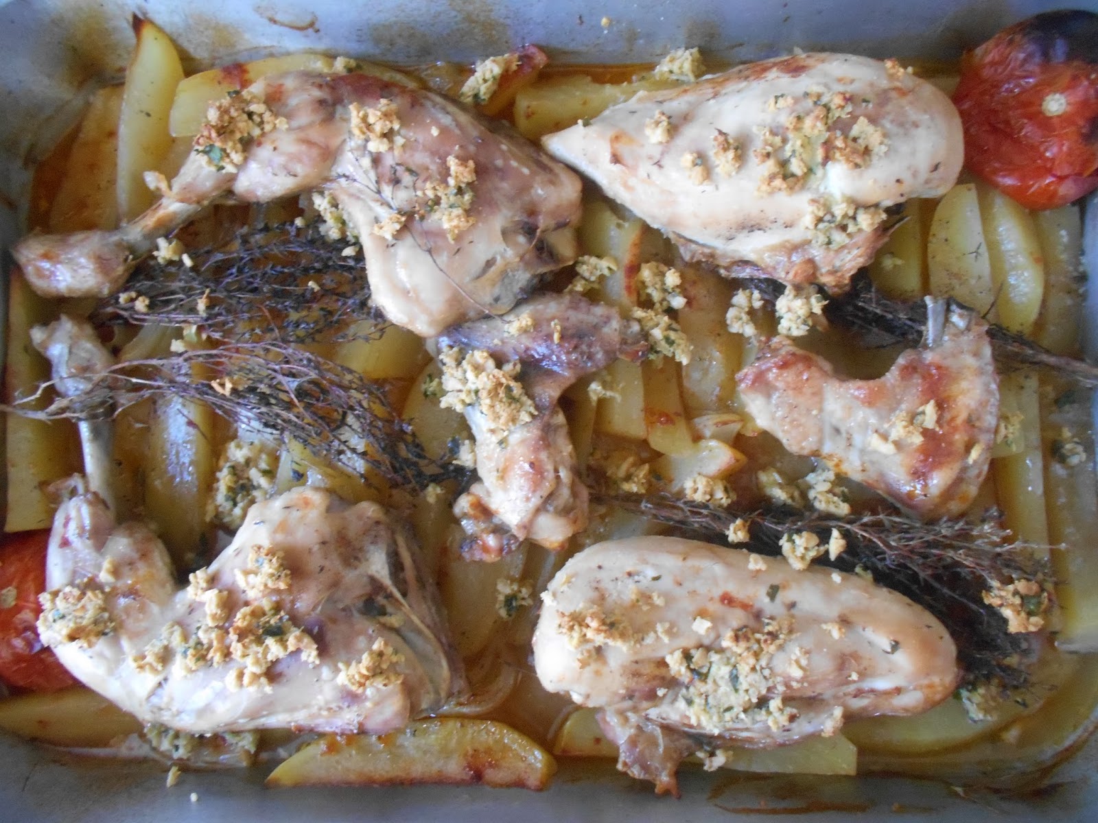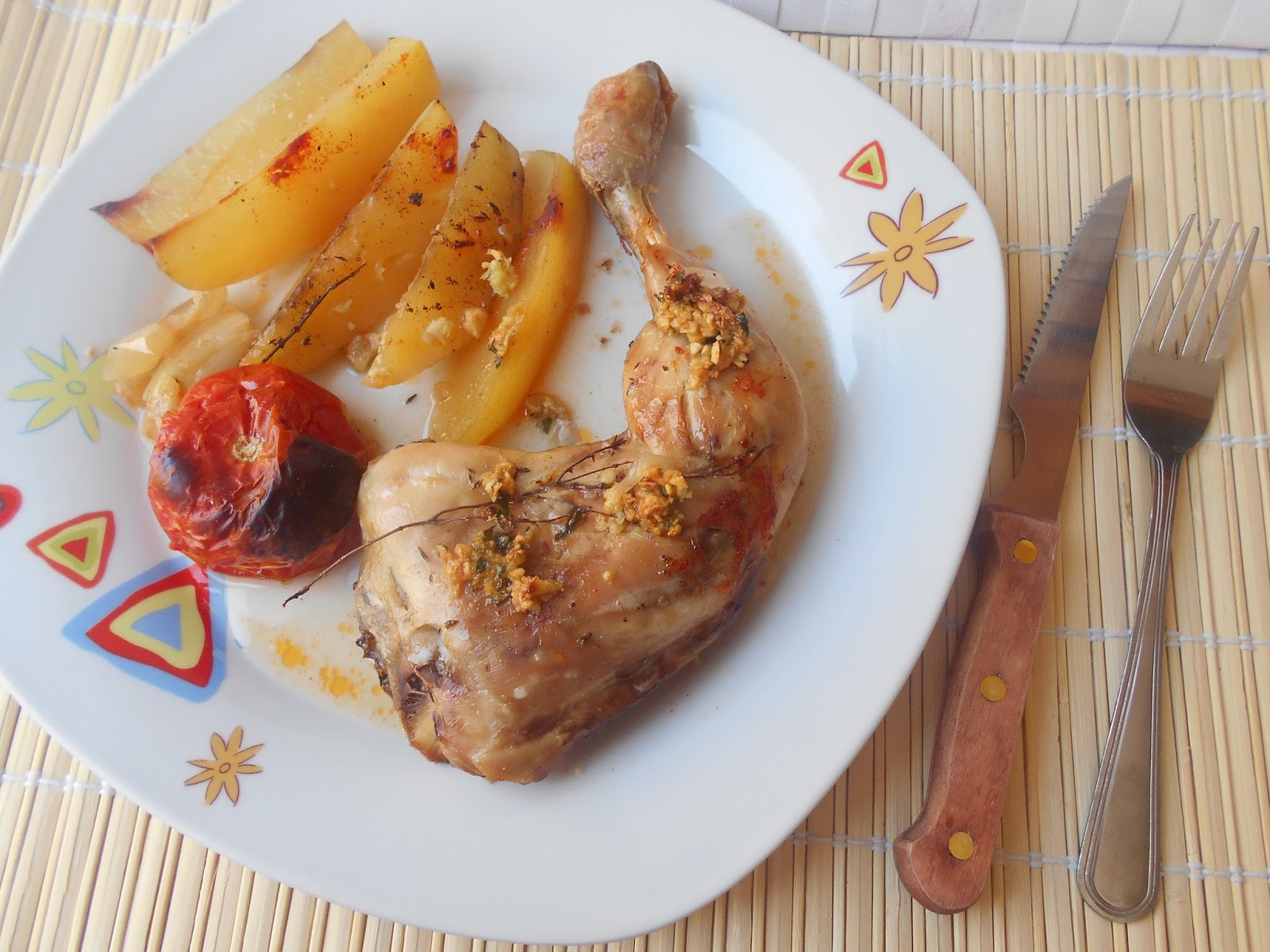 Retiramos del horno, y servimos el pollo acompañado de la guarnición de patatas, cebolla y tomate.
