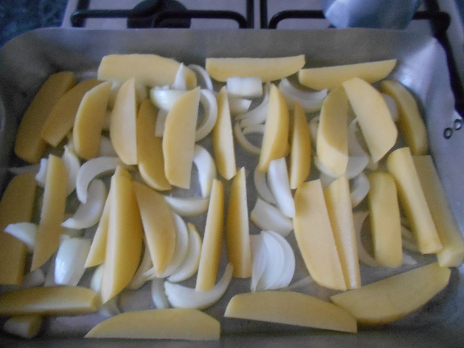 Disponemos la cebolla y las patatas en una bandeja de horno