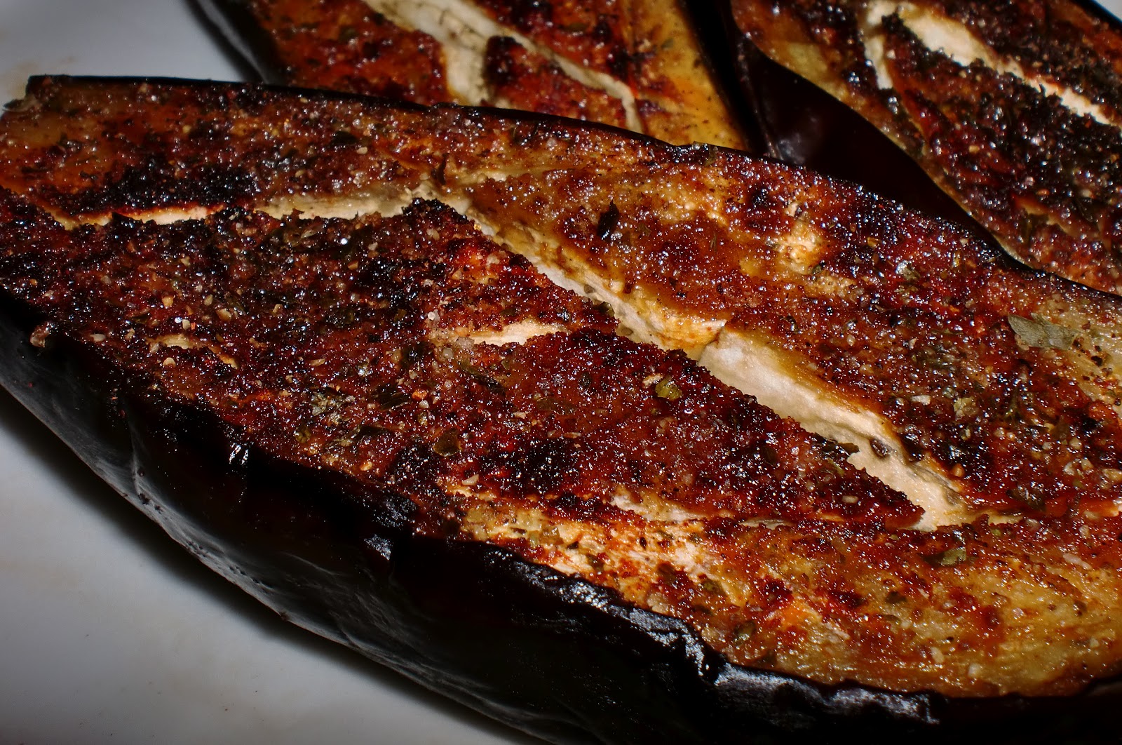 Lavamos las berenjenas y las secamos. Las abrimos en dos o tres porciones dependiendo del grosor de las berenjenas y les hacemos unos cortes para que se asen más rápido. Las colocamos en una fuente de horno.
