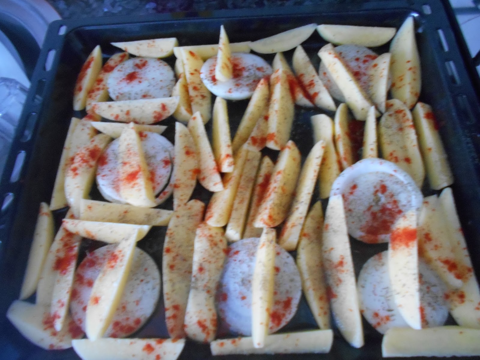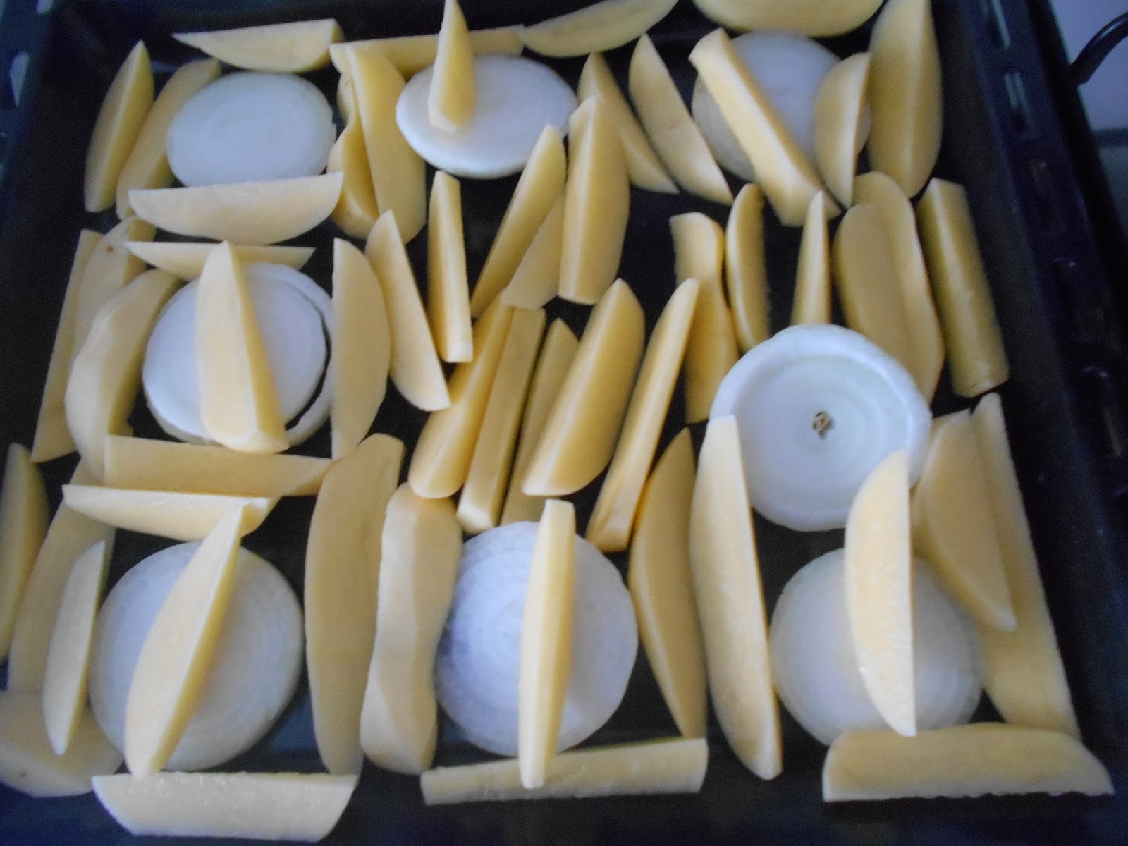 Cortamos las patatas en gajos y la cebolla en rodajas