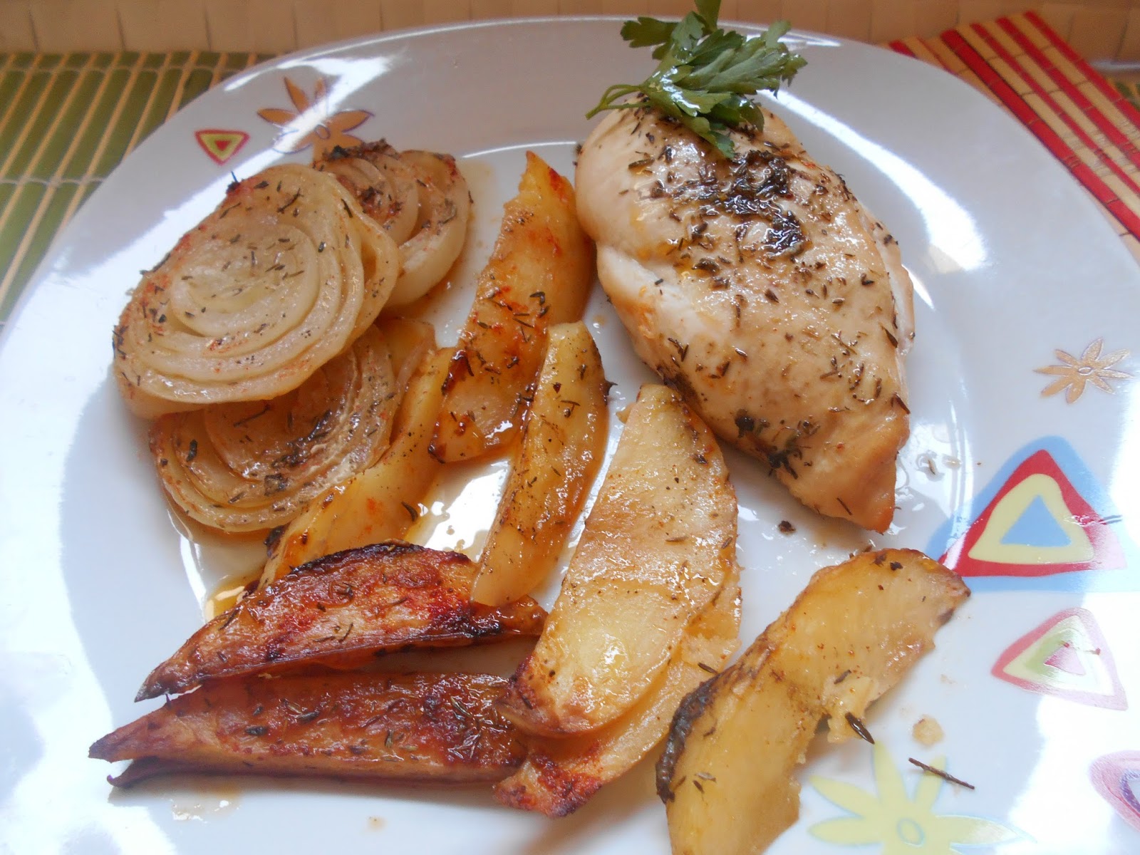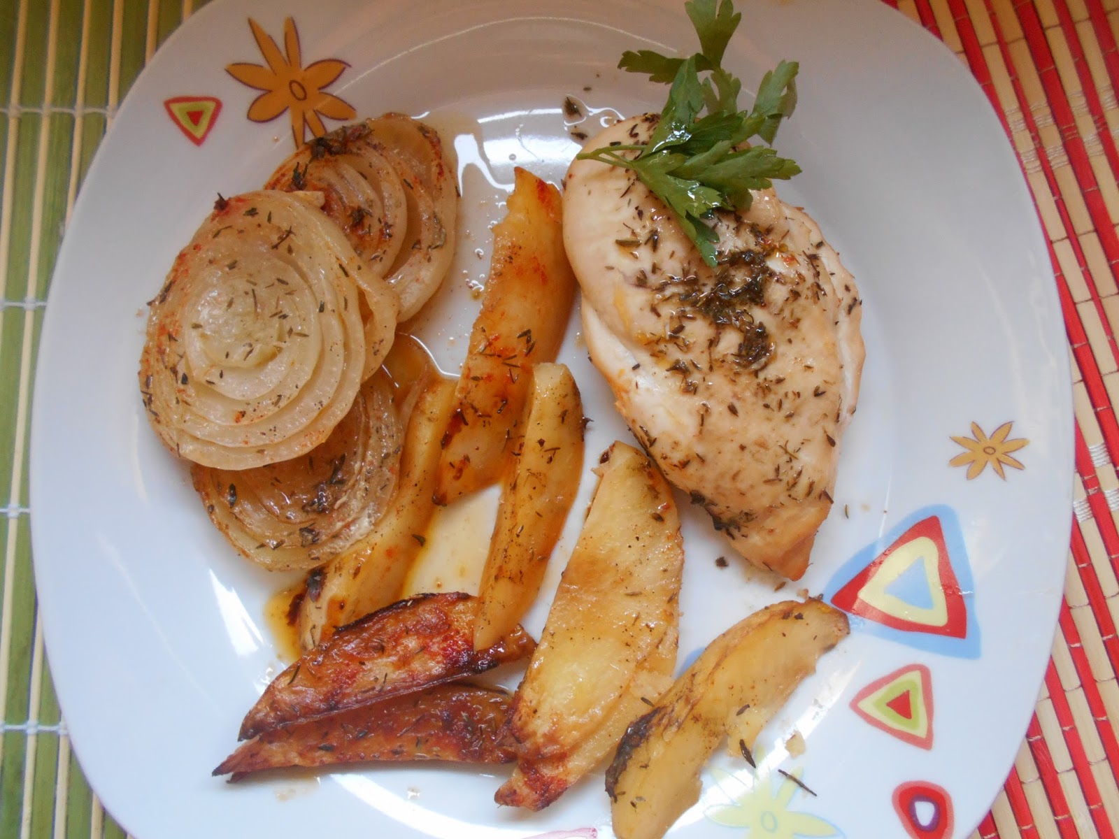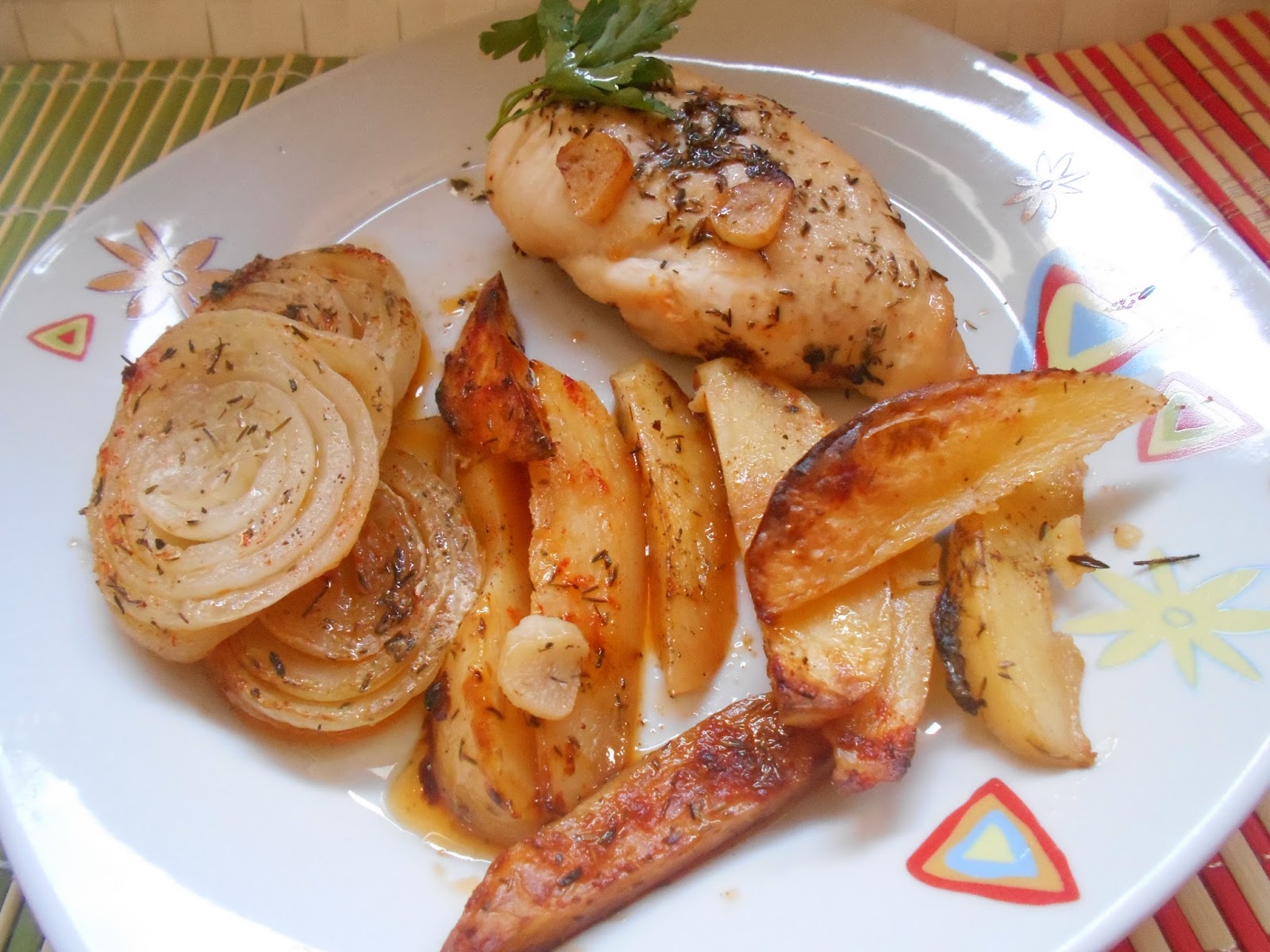 Horneamos, con el horno precalentado, a 200º unos 40 min. o hasta que quede dorada la pechuga y asadas las patatas.