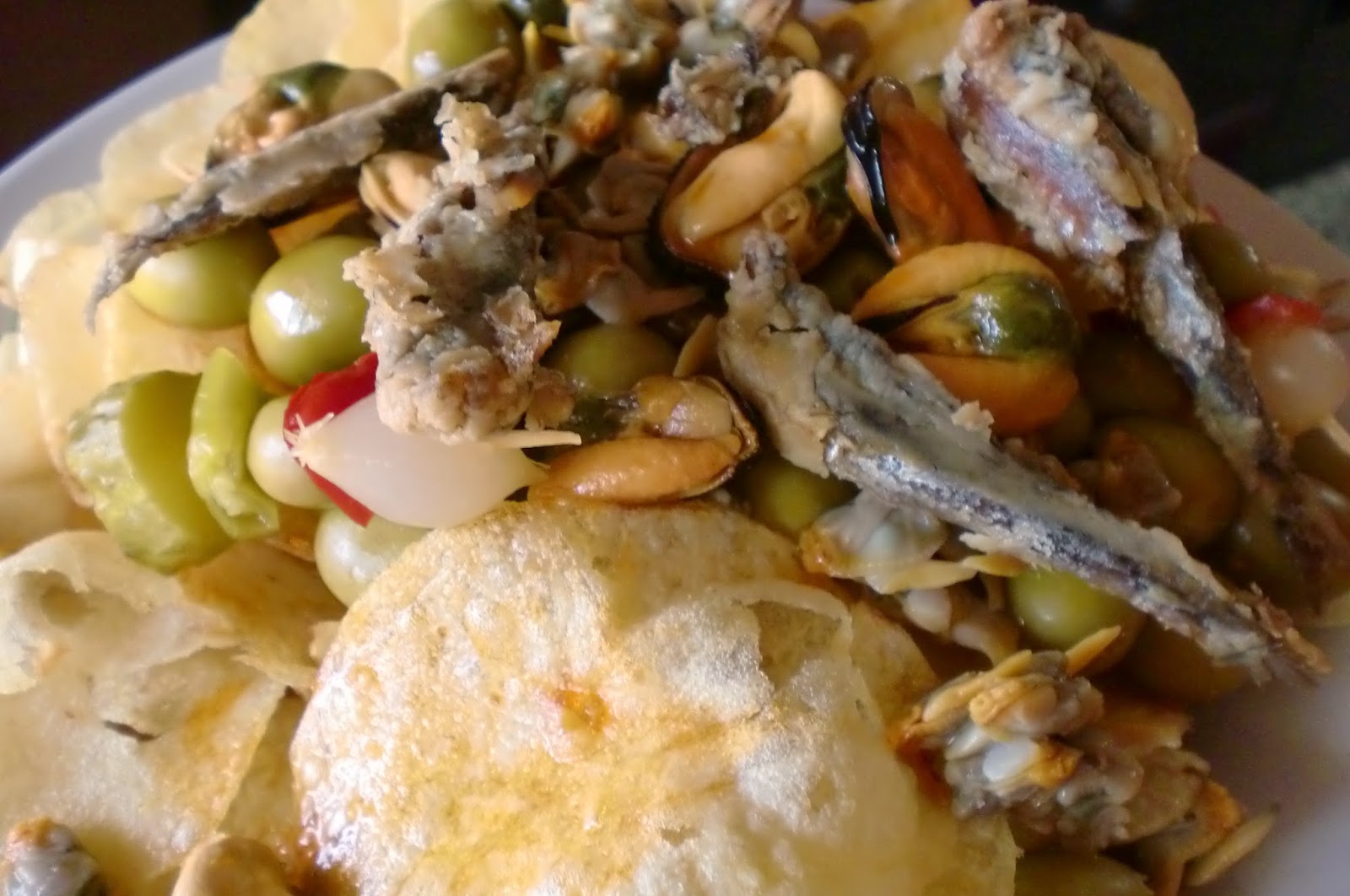Este plato admite multitud de variantes, como os decía anteriormente, y va según los gustos de cada comensal.  Hoy lo hice así pero otro día según lo que tenga en casa… boquerones fritos, boquerones en vinagre, cacahuetes, almendras, … vamos lo que se os ocurra (respetando las bases)