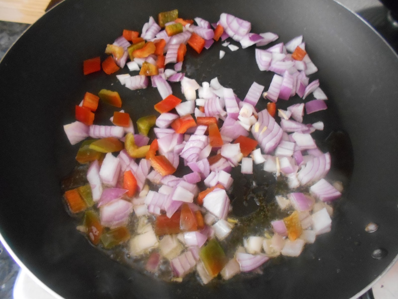 echamos aceite en la paella y sofreimos la cebolla y el pimiento.