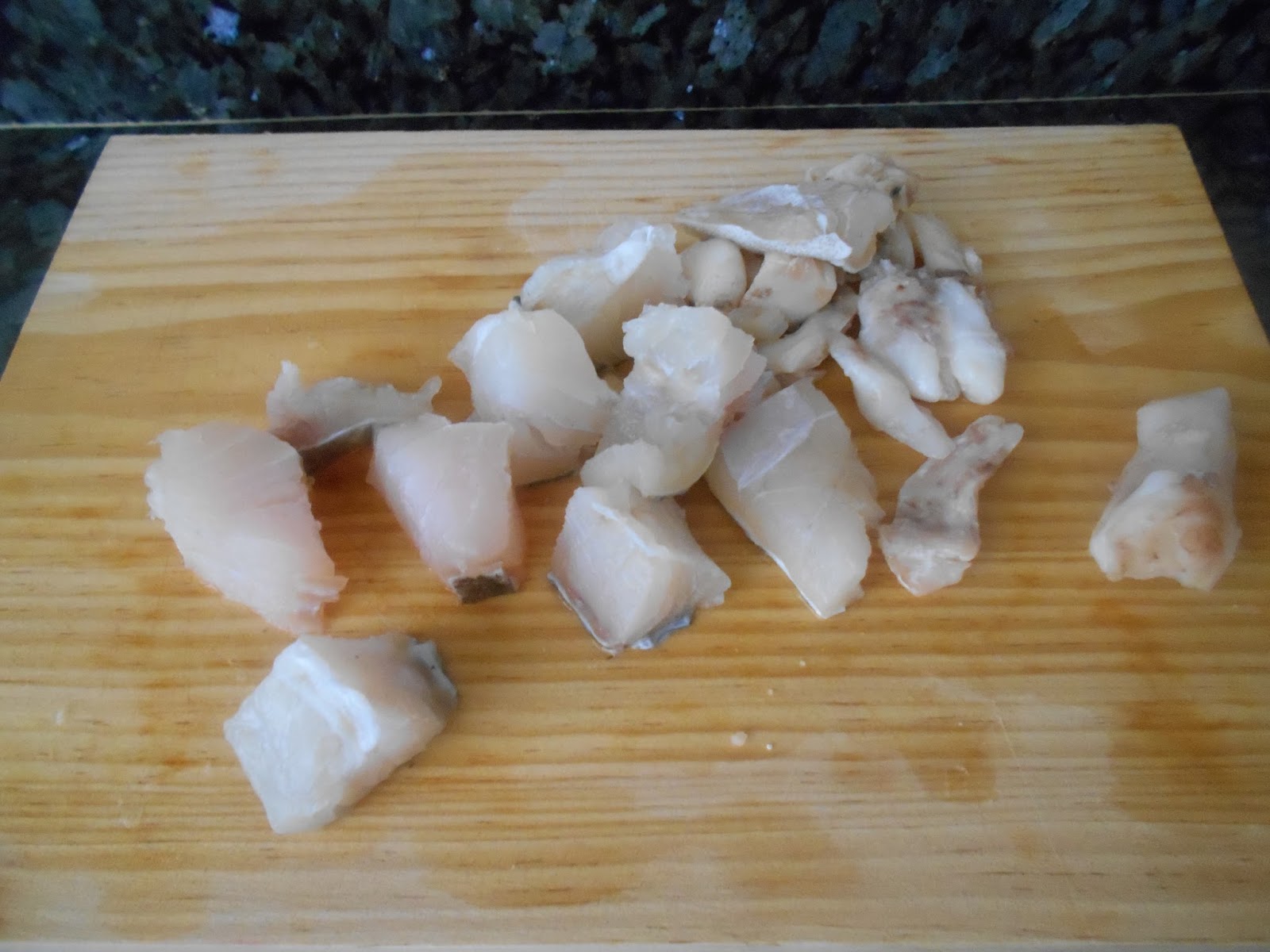 Cortamos el bacalao en taquitos.