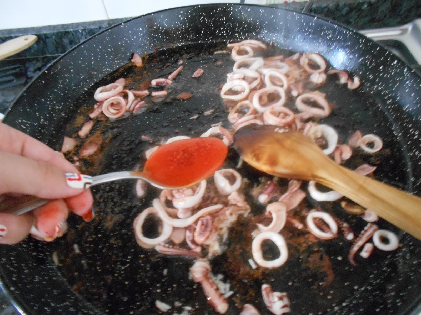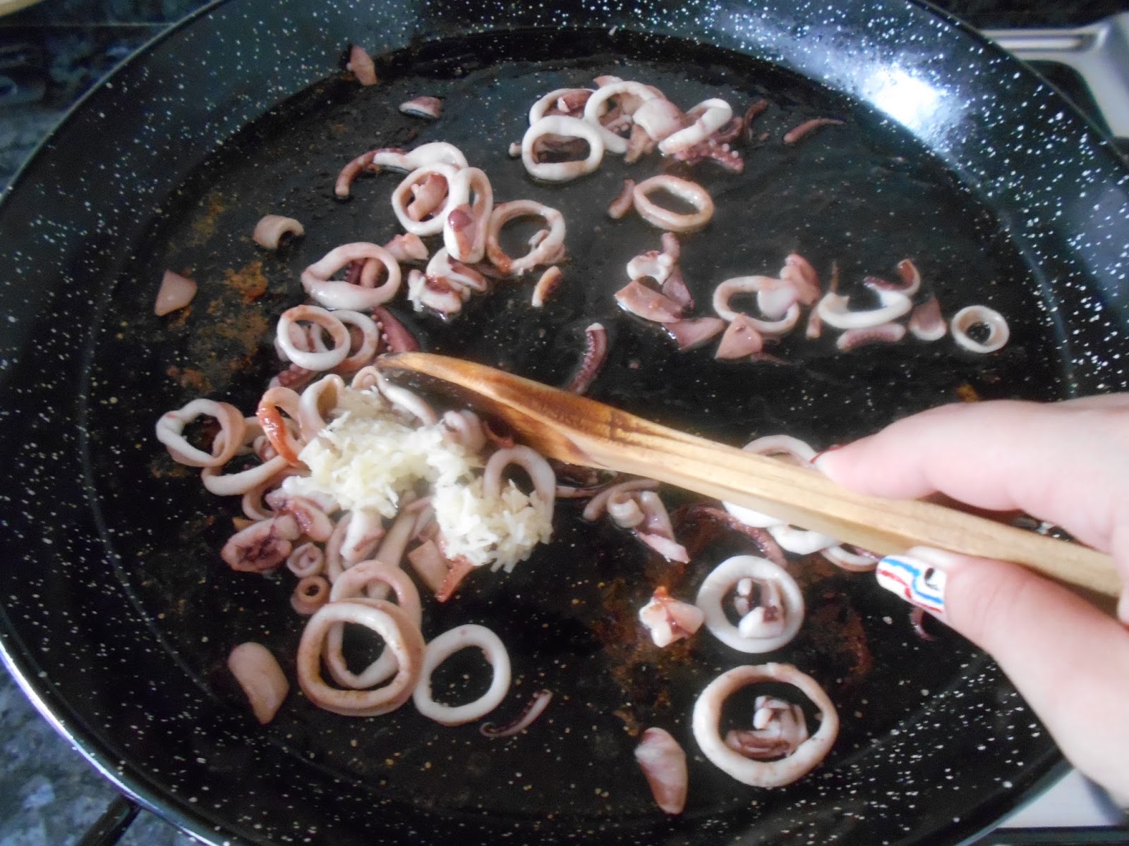 Limpiamos y troceamos los calamares. Lo sofreimos en la paella.