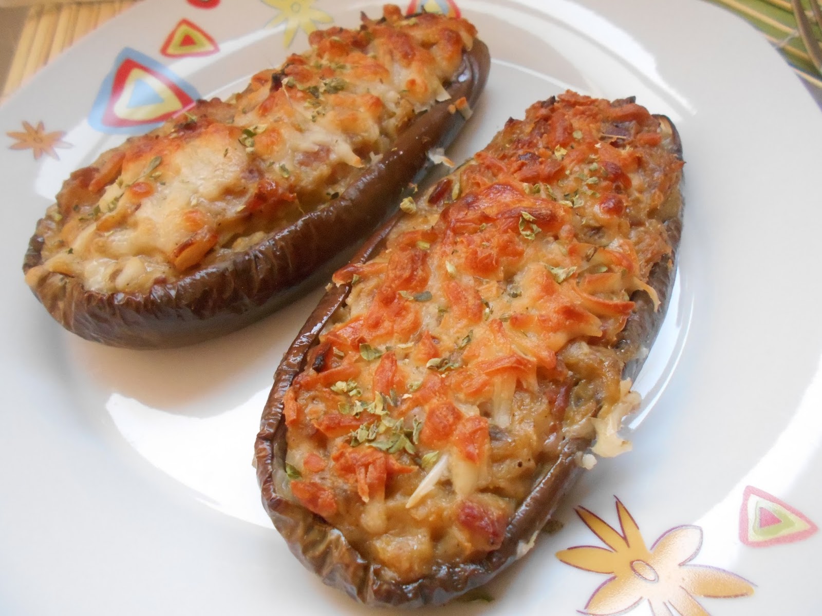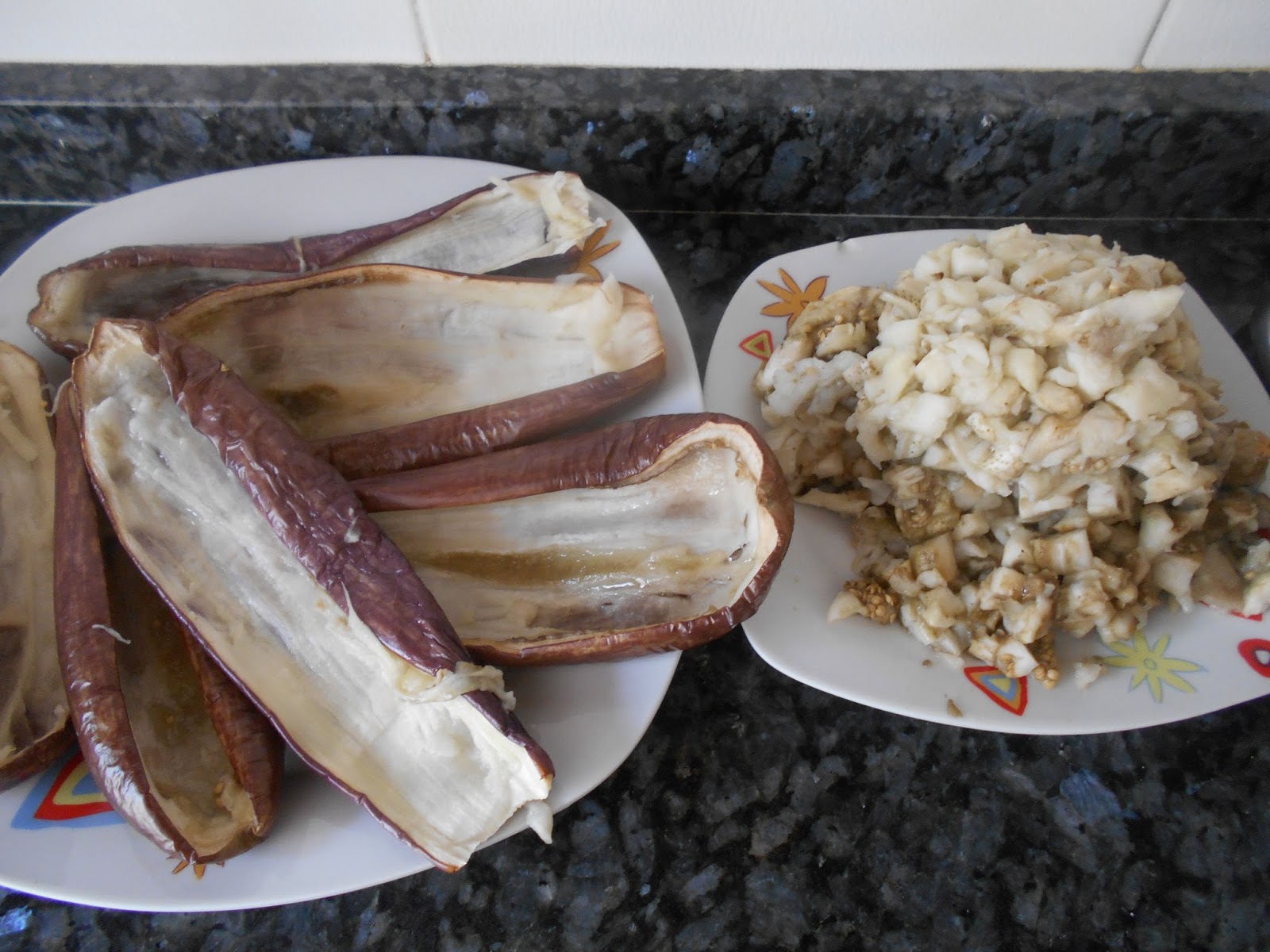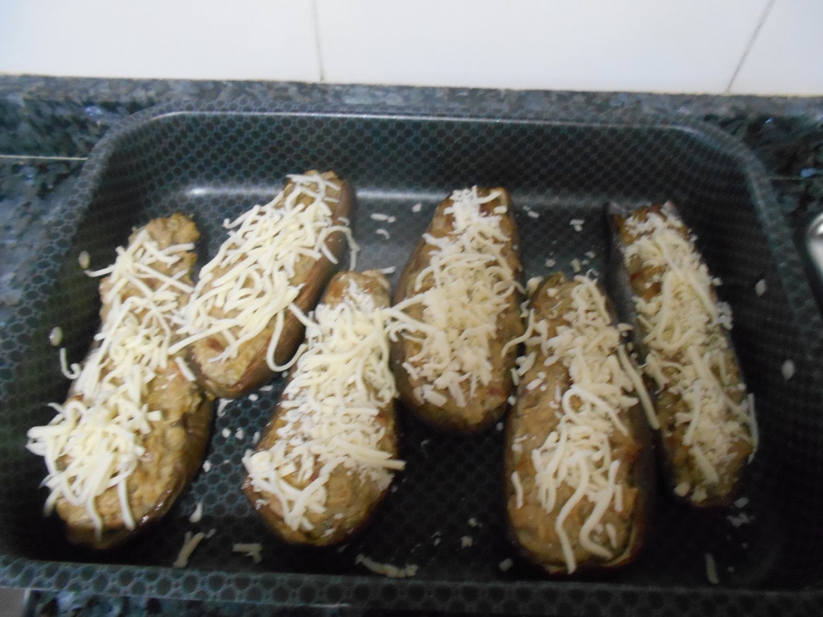Disponemos las berenjenas en una fuente. Rellenamos las berenjenas. SI OS SOBRA RELLENO NO LO TIREIS QUE OS DARE OTRA RECETA PARA APROVECHARLO