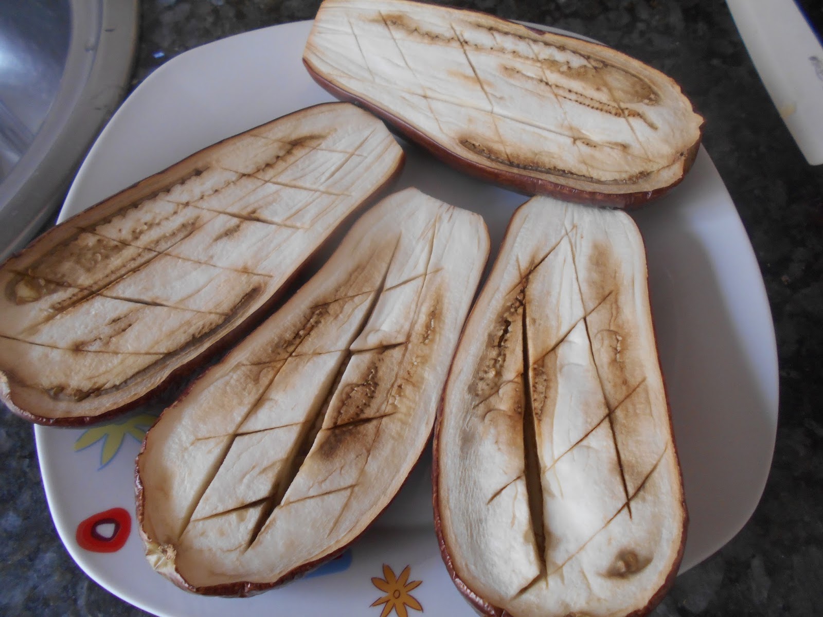Cortamos las berenjenas en 2 mitades y hacemos unos cortes.