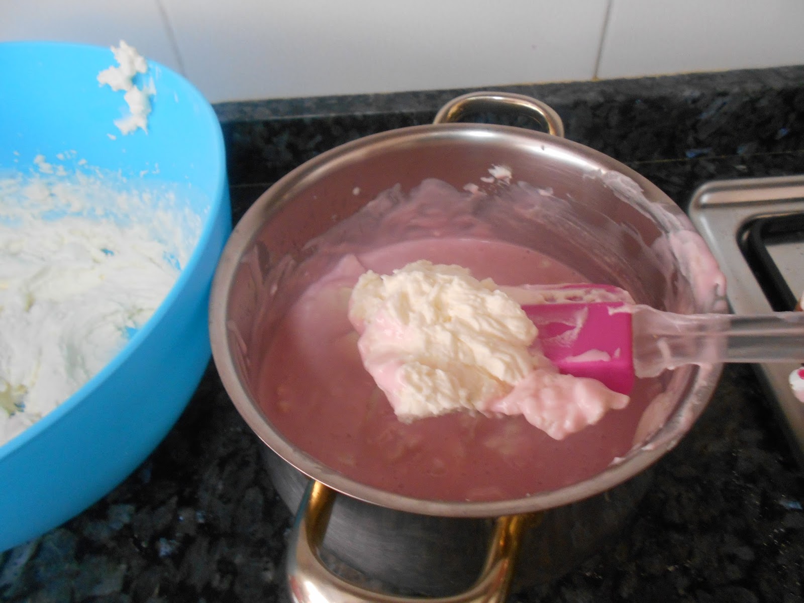 Echamos el queso y batimos para que quede homogéneo y añadimos 2 gotas de colorante rojo