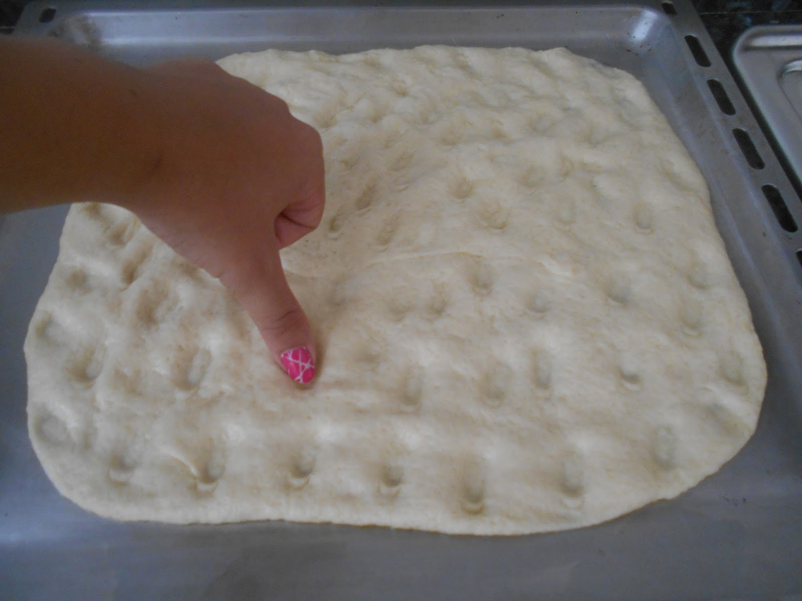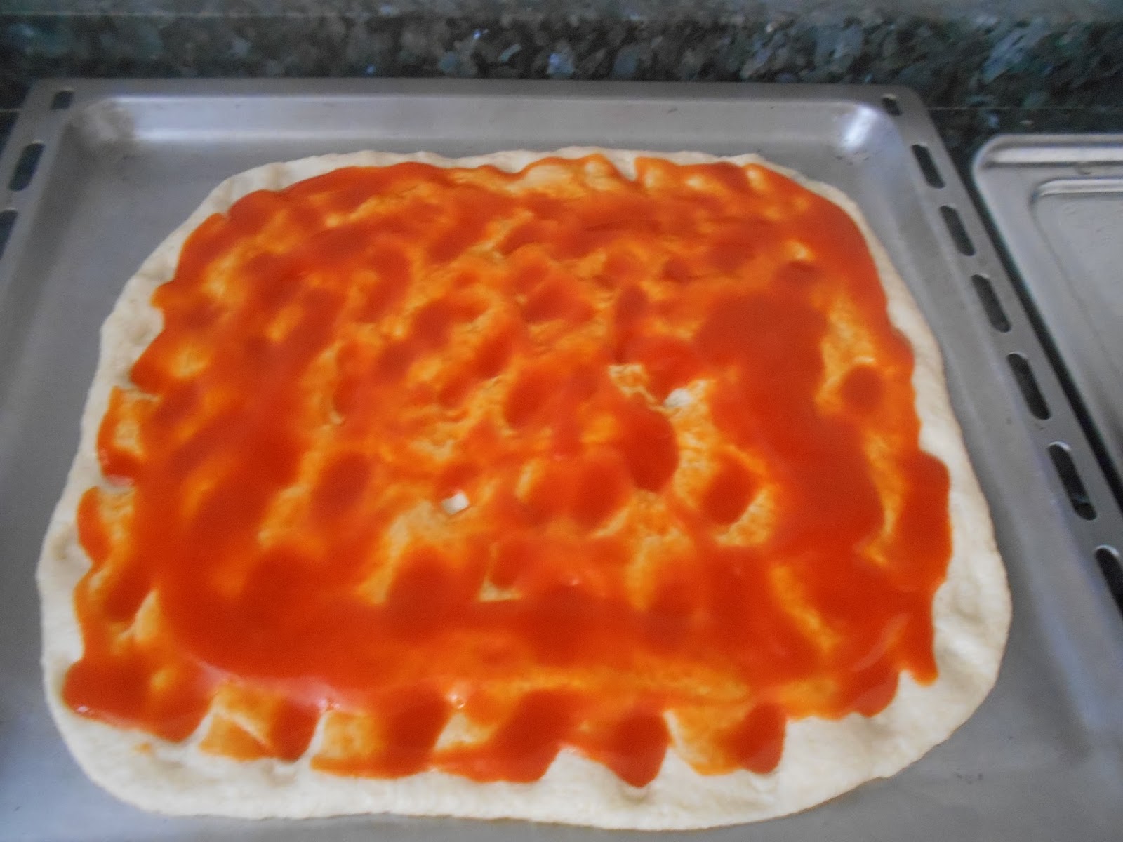 Ahora se vierte la masa (esta receta nos da para dos cocas) sobre una bandeja para horno, previamente untada de aceite.