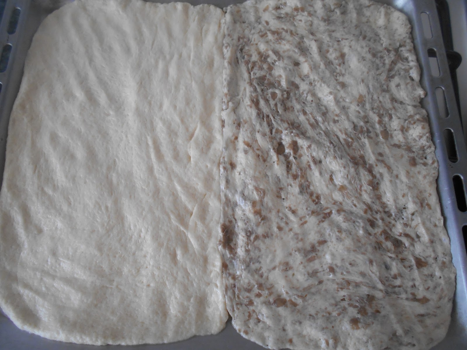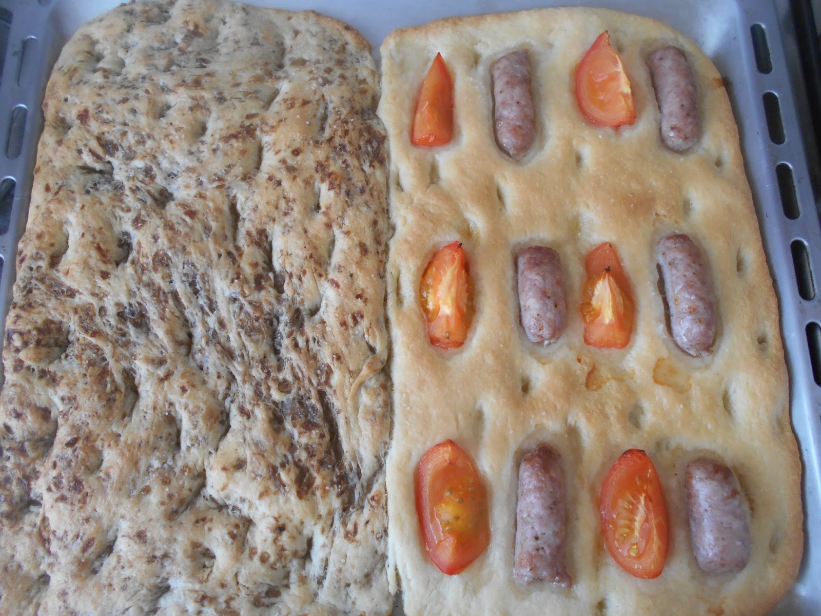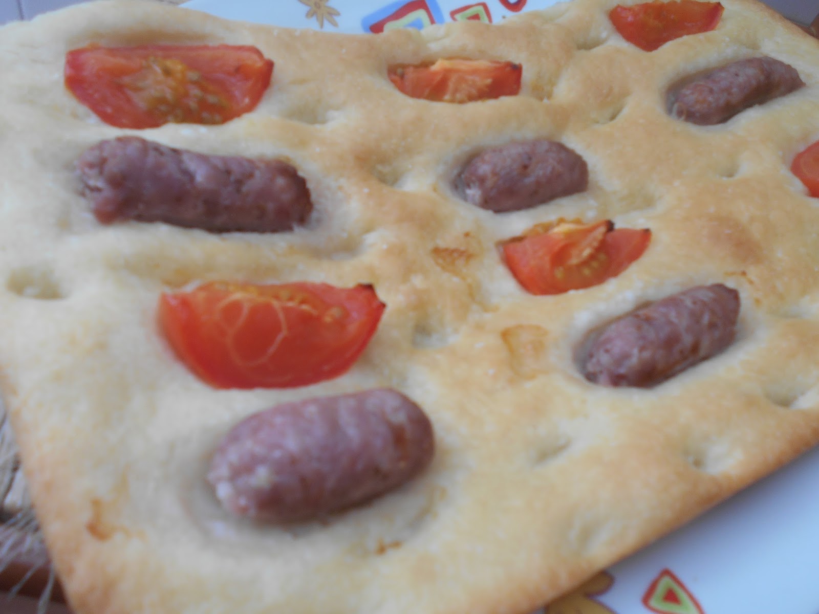 Vamos disponiendo las longanizas y el tomate al gusto de cada uno, en la parte de la masa que no lleva morcilla.