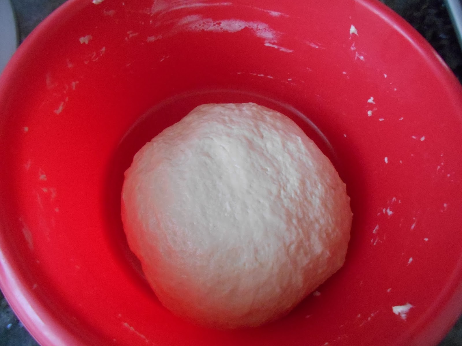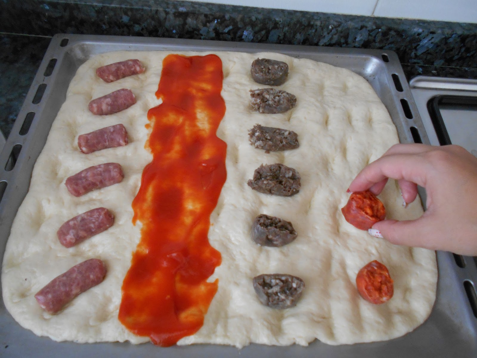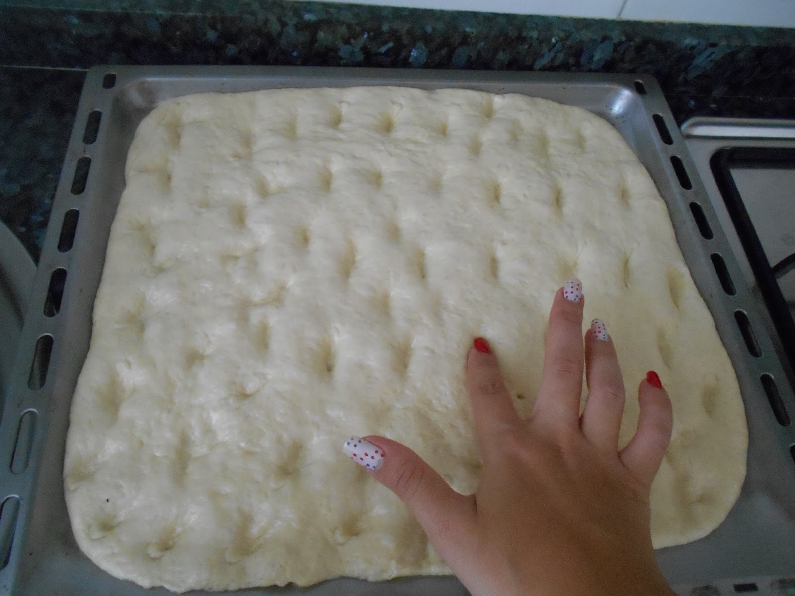 Disponemos la masa en una bandeja de horno untada con aceite, y la dejamos que suba hasta q doble de tamaño.