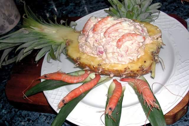 En un cuenco mezclamos la piña, las gambas, el ron, el limon, y las especias.